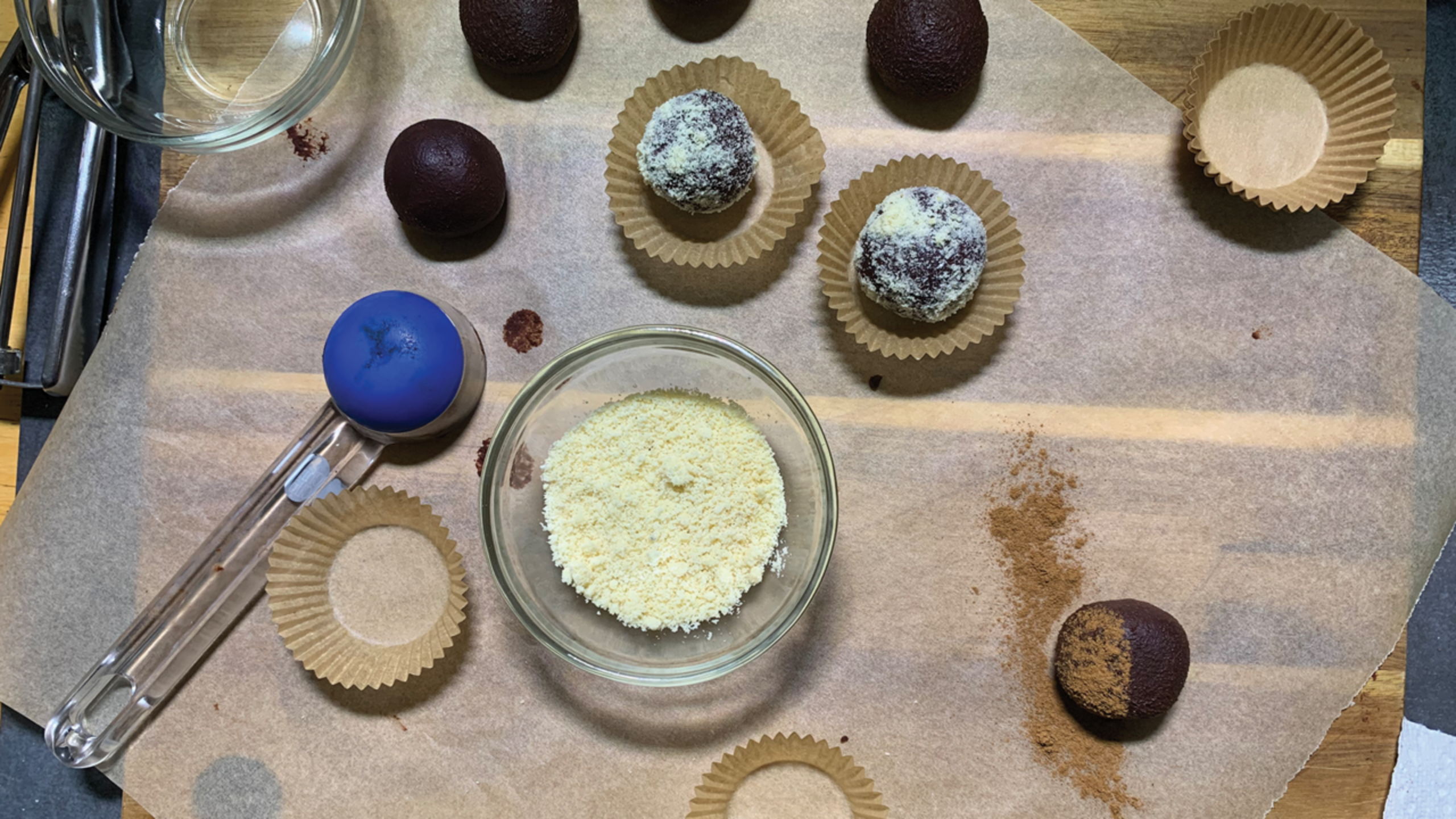 If you are a “hands-on” kind of person, shaping the truffles by hand works best if you wear latex cooking gloves. You can also rub a very small amount of flavorless oil onto your hands if you don’t use gloves.