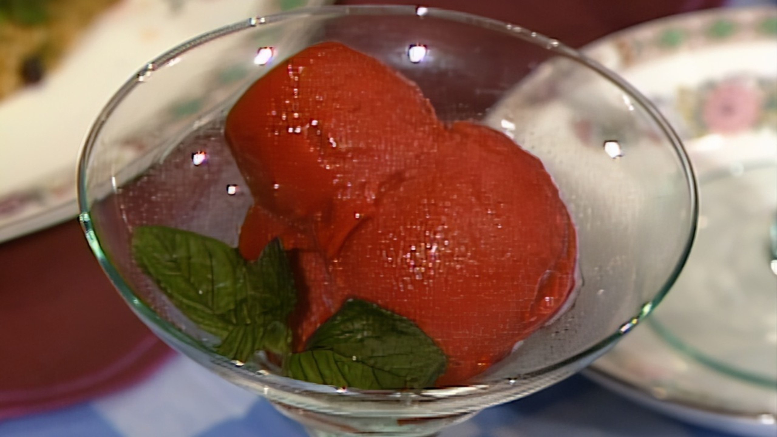Transfer the frozen puree to a bowl of a food processor and process until light, fluffy and smooth, about 20 seconds. Return the lightened puree to the metal pan and return it to the freezer for another 2 ½ to 3 hours. Alternatively, at this point, to make ahead, the mixture can be completely frozen and then softened by moving to the refrigerator for about an hour before serving.