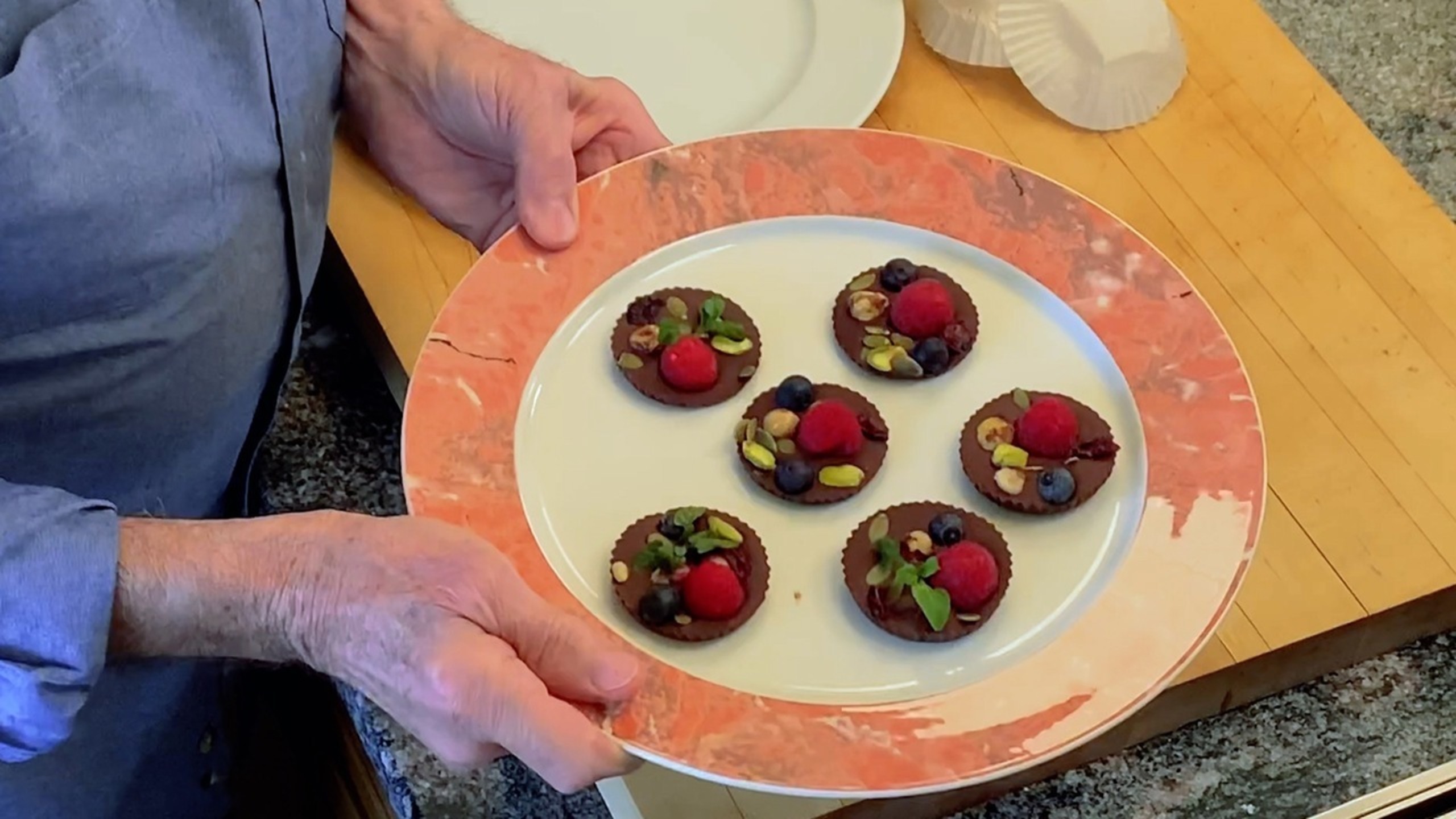 Arrange up to 12 paper cupcake liners on a baking sheet. Pour about ¼-inch of melted chocolate into each liner (or it can be thicker if making less). Top with a selection of nuts and fruit to your liking. Refrigerate until set, about 30 minutes.