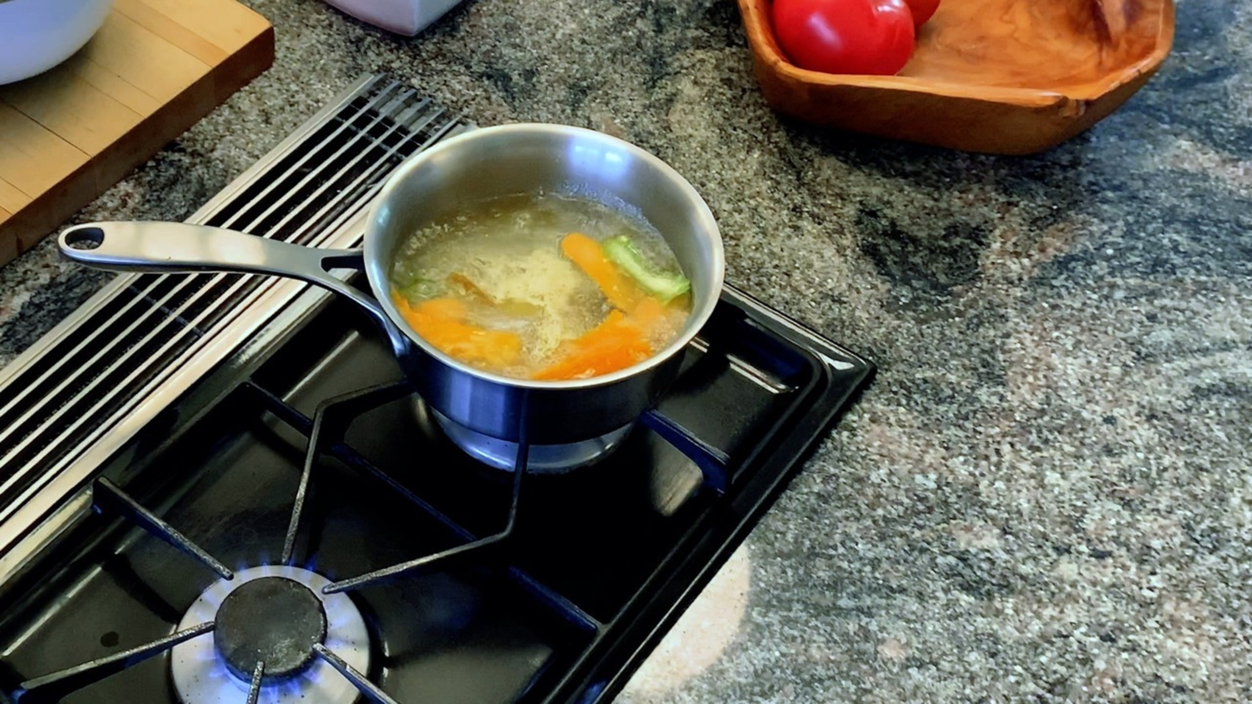 To make sure the peel doesn’t get bitter, cut with a vegetable peeler so you only have the zest or surface of the skin without any of the white pith underneath and blanch it in boiling water.