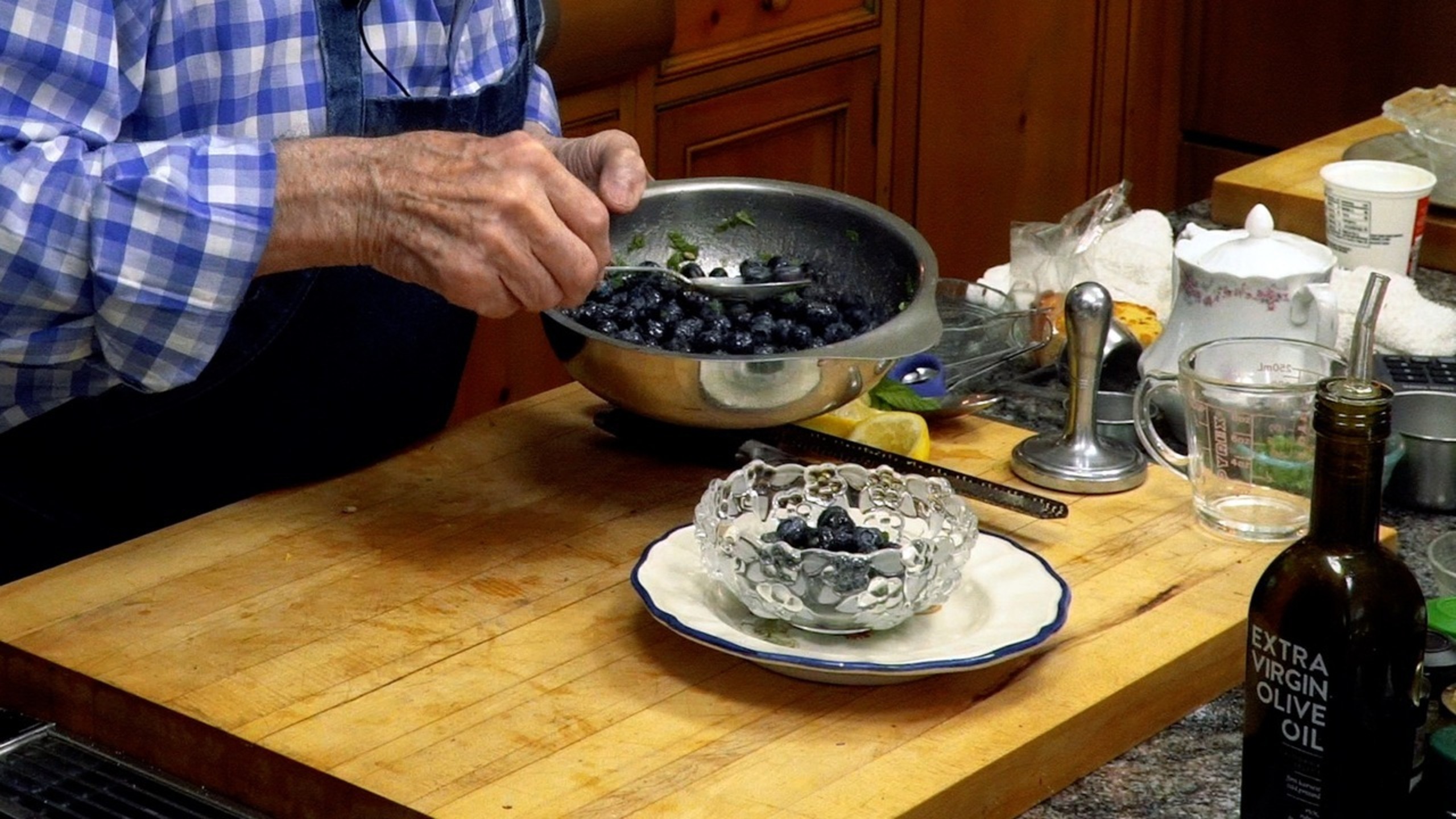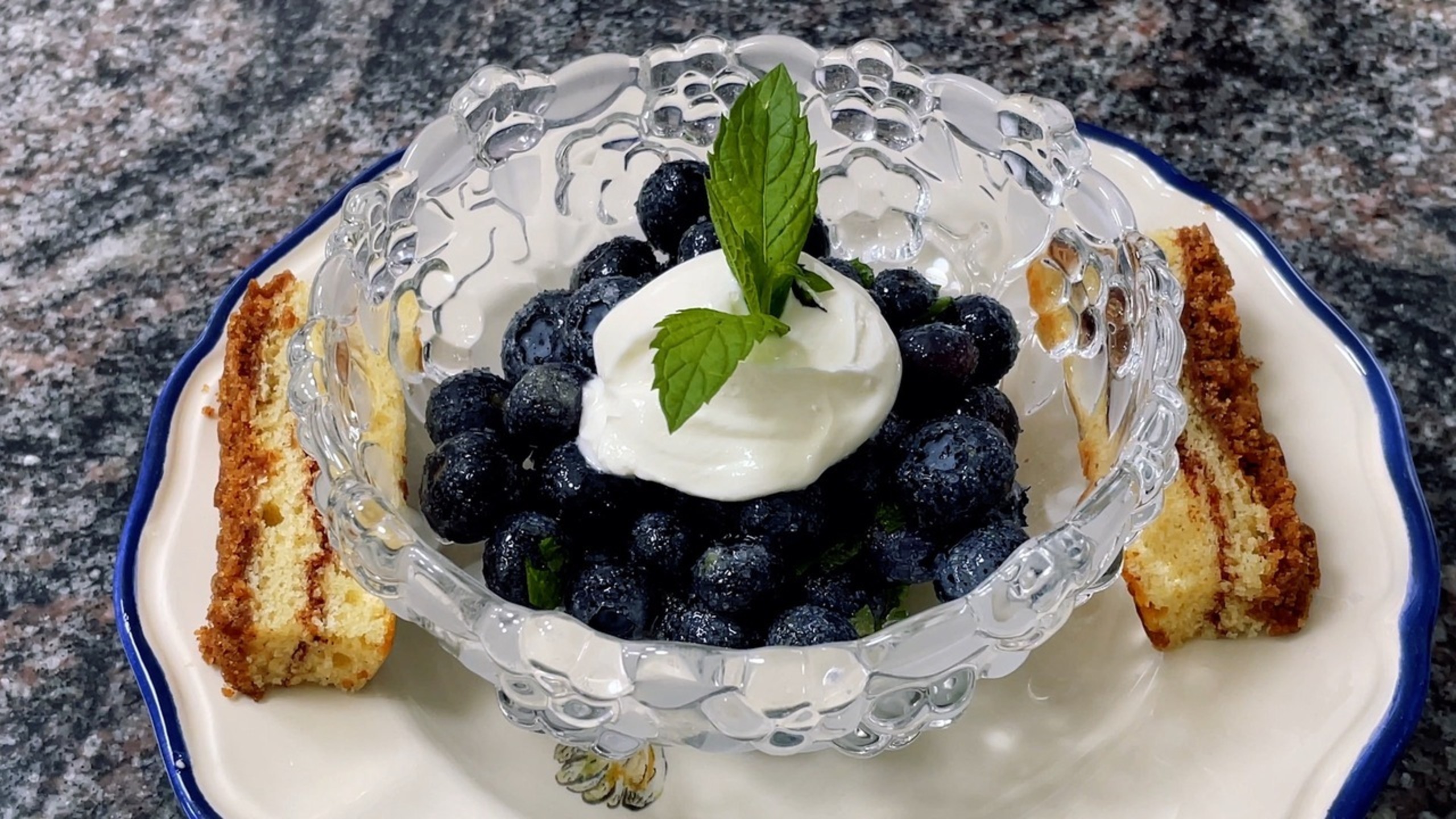 To serve, spoon the blueberries into a dish and top with a dollop of crème fraîche and a sprig of mint. Add a piece of cake or cookies on the side.