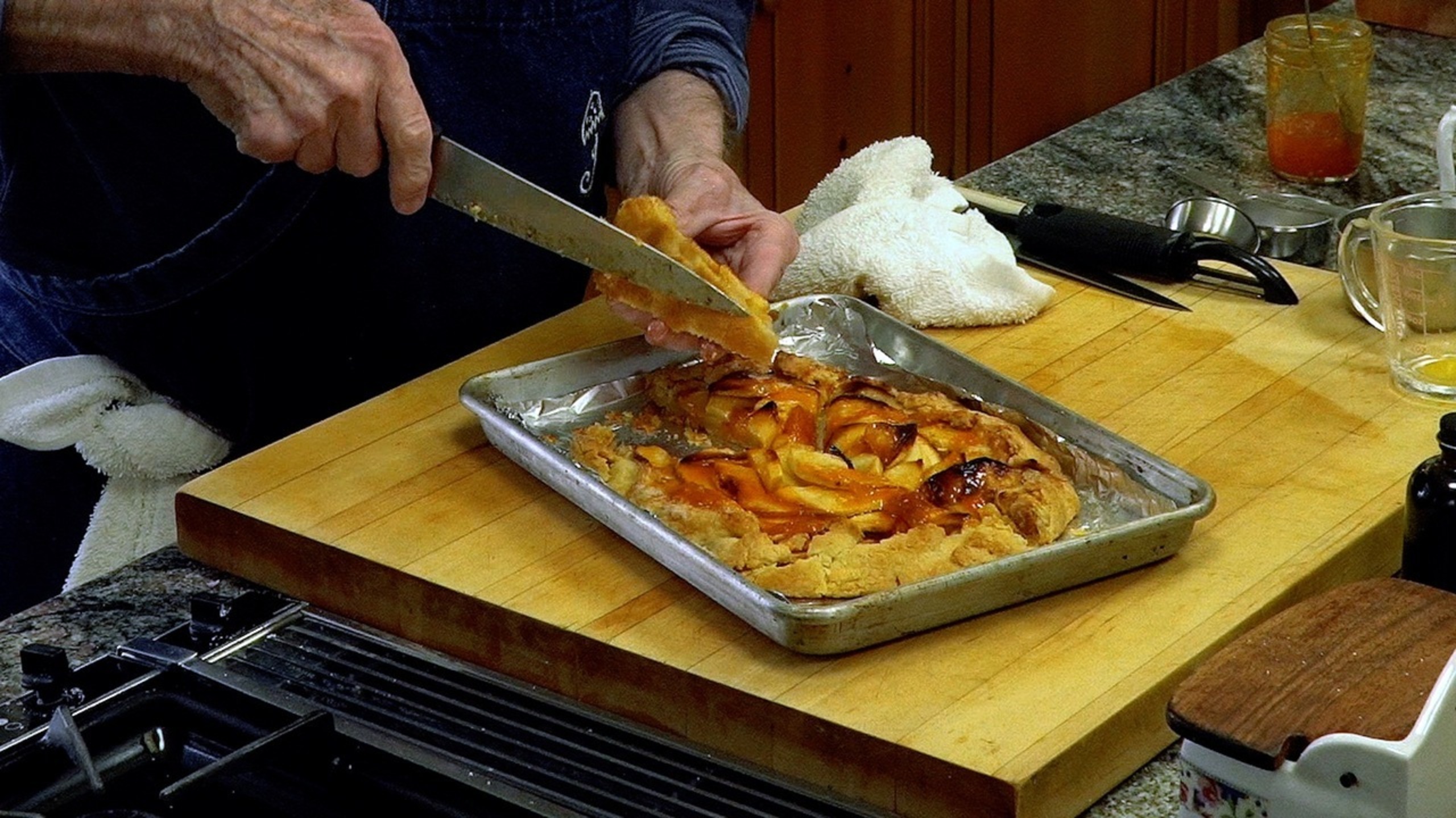 Warm the apricot jam in the microwave, about 1 minute on full power. Using a spoon, spread the jam over the warm apples to glaze the tart.