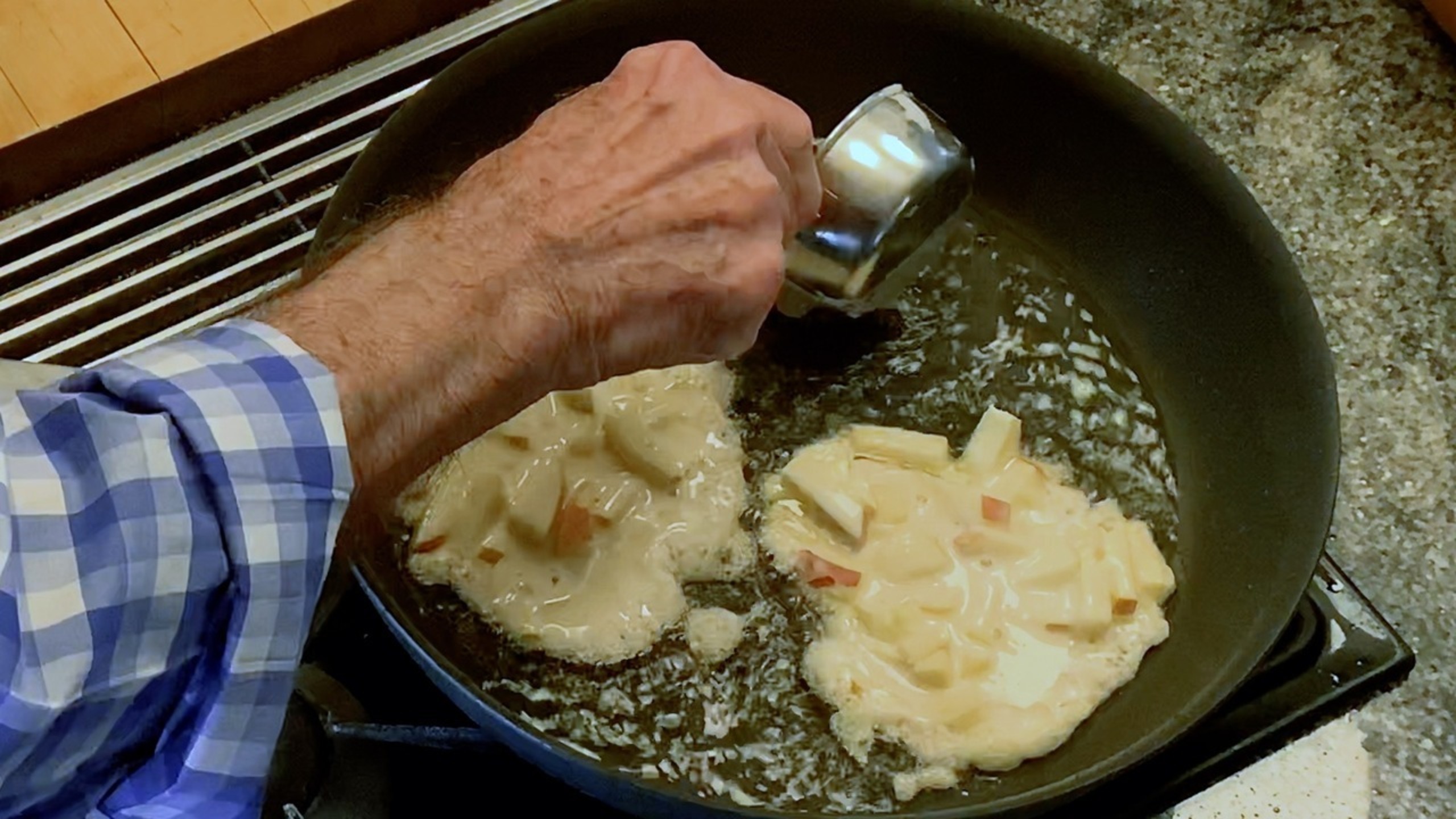 Heat the oil in a large sauté pan over medium-high heat. (Let the pan heat up while preparing the batter.)