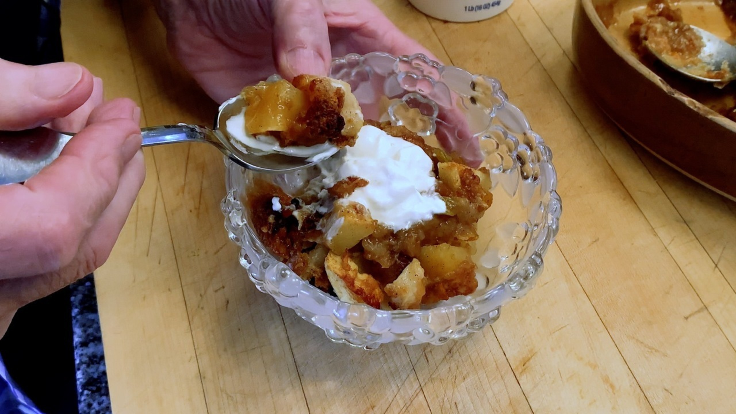 Spread the mixture in the gratin dish and bake until the apple and pear are cooked through and the top is golden about 45 minutes. Let sit for at least 15 minutes before serving.