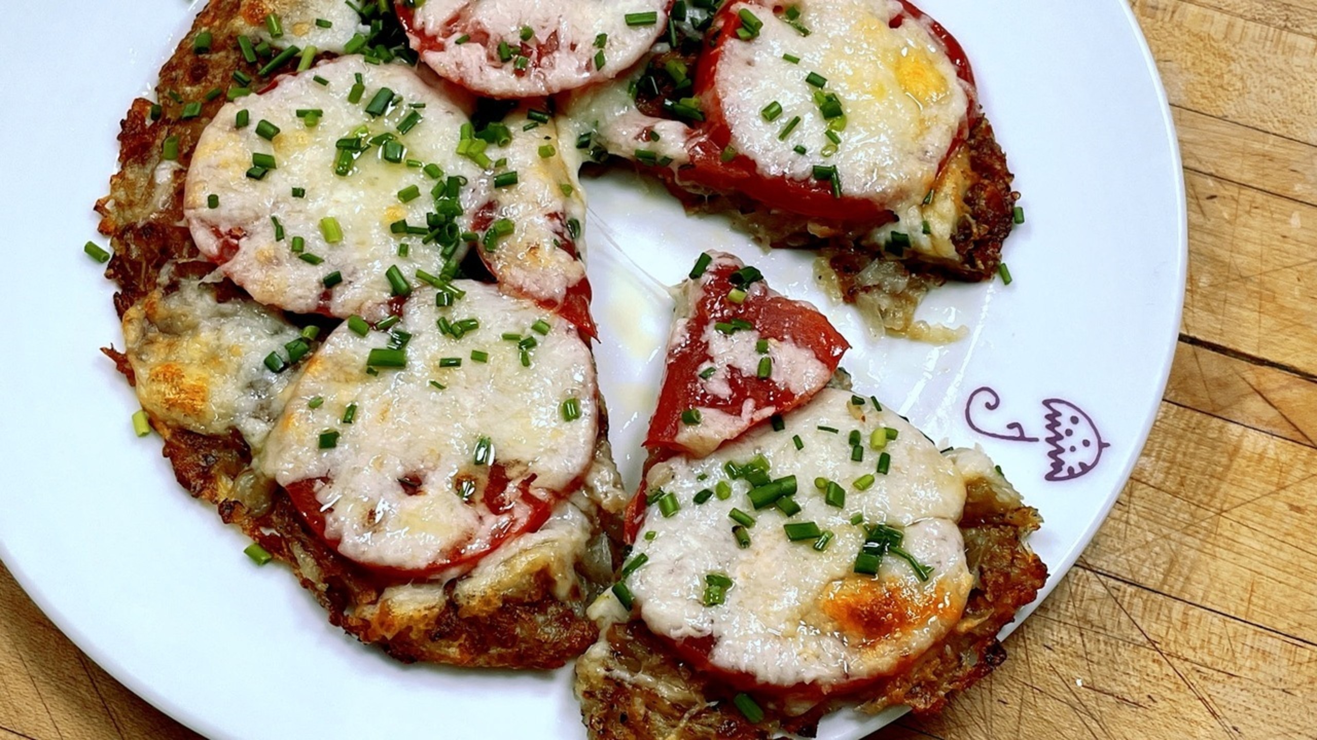 Arrange the tomato slices on top of the potatoes and sprinkle with the shredded cheese. Bake until the cheese has melted, 10 to 12 minutes. Garnish with the chives, drizzle with a little extra-virgin olive oil and cut into wedges.