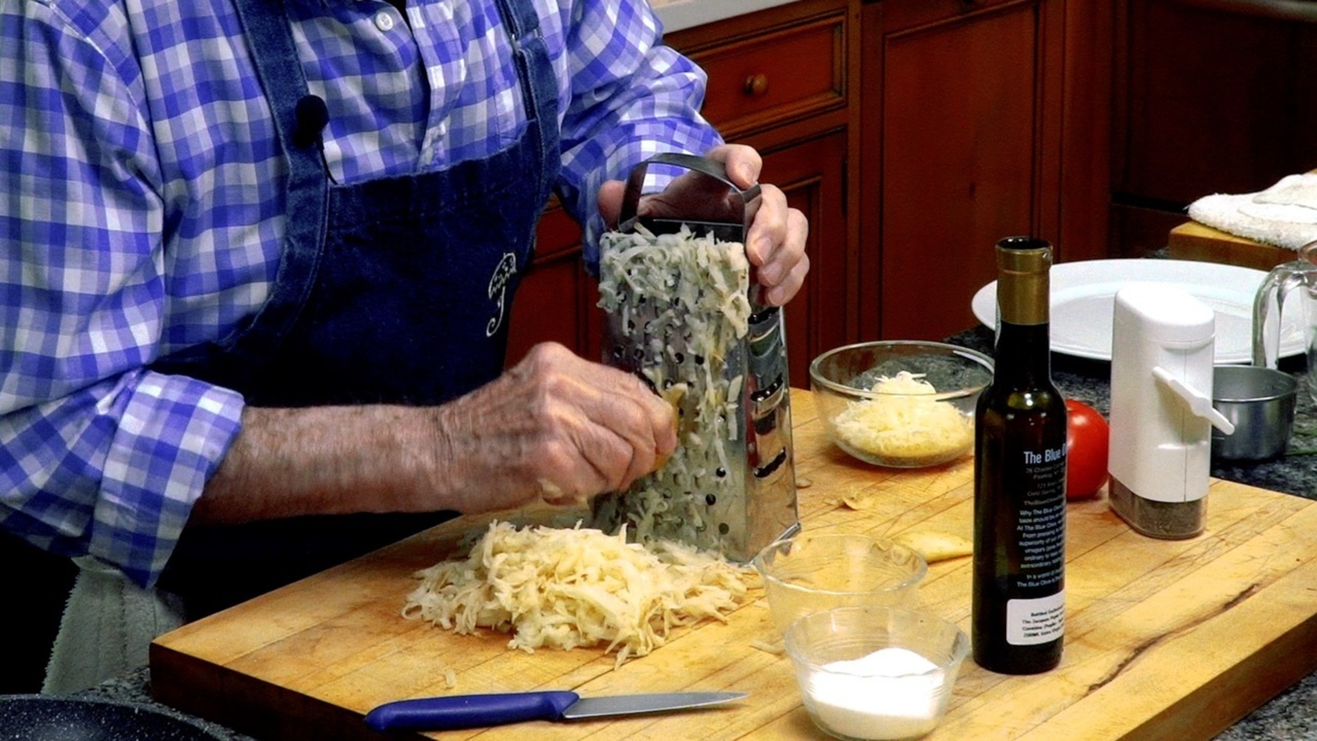Using a box grater, shred the potatoes on the coarse side. Using your hands, press any liquid from the shredded potato and discard. You should have about 2 ½ cups of shredded potatoes. Season with salt and pepper and, using your hands, mix well.