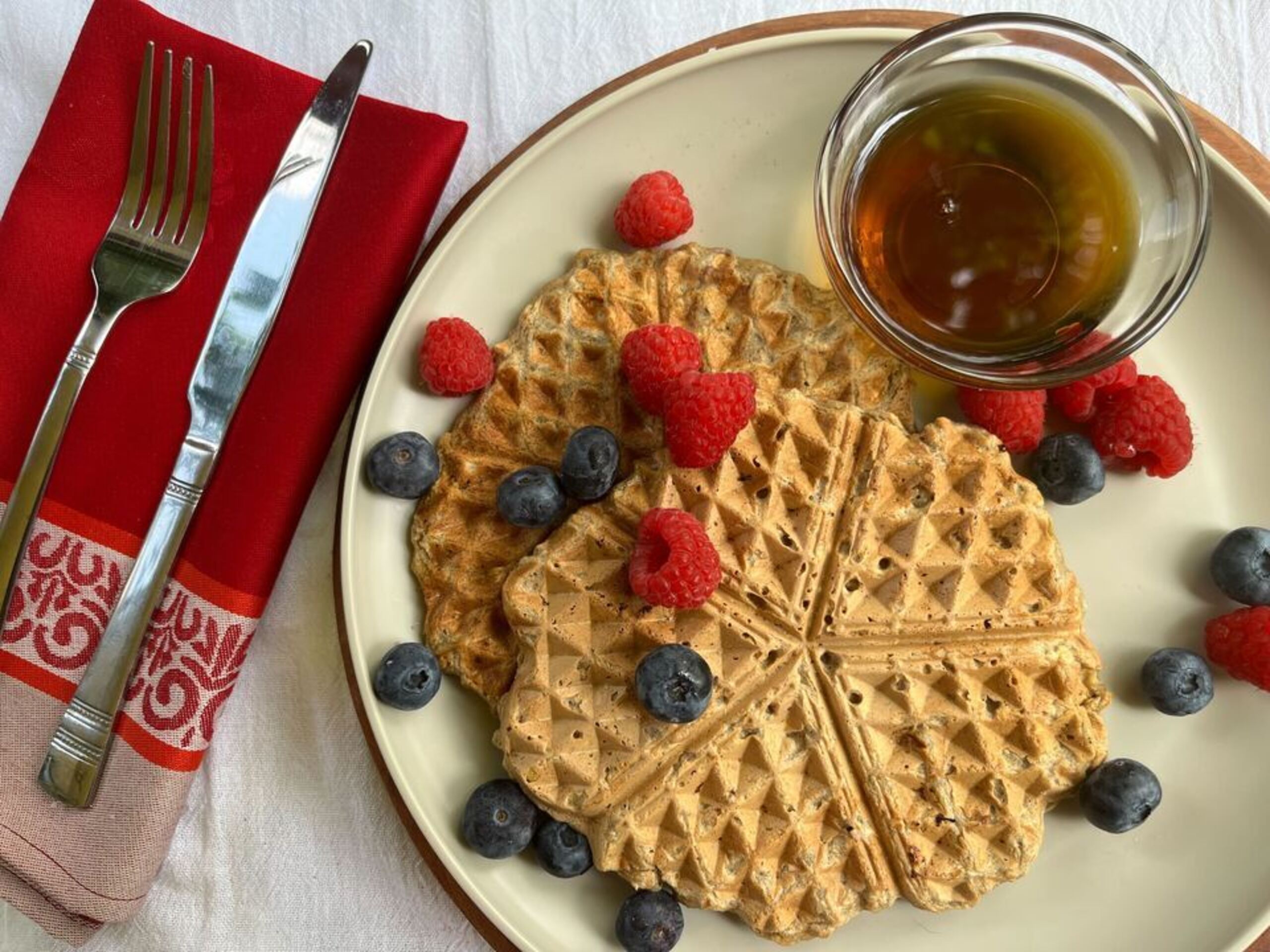 Remove the cooked waffle from the waffle iron, and serve immediately with pure maple syrup and fresh fruit.