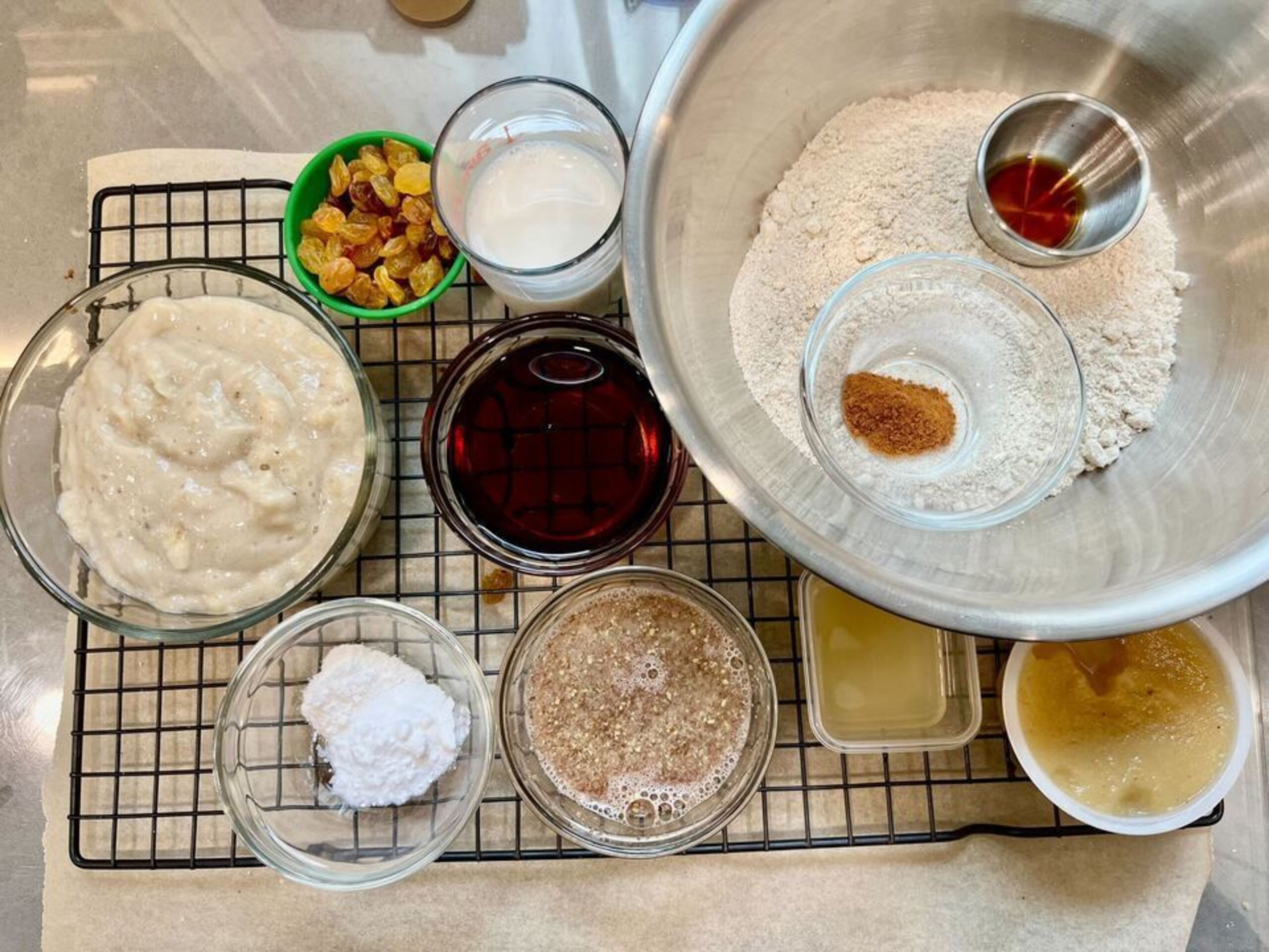 Add applesauce, maple syrup, lemon juice, plant milk, flaxseed-water mixture, and vanilla. Mix well.