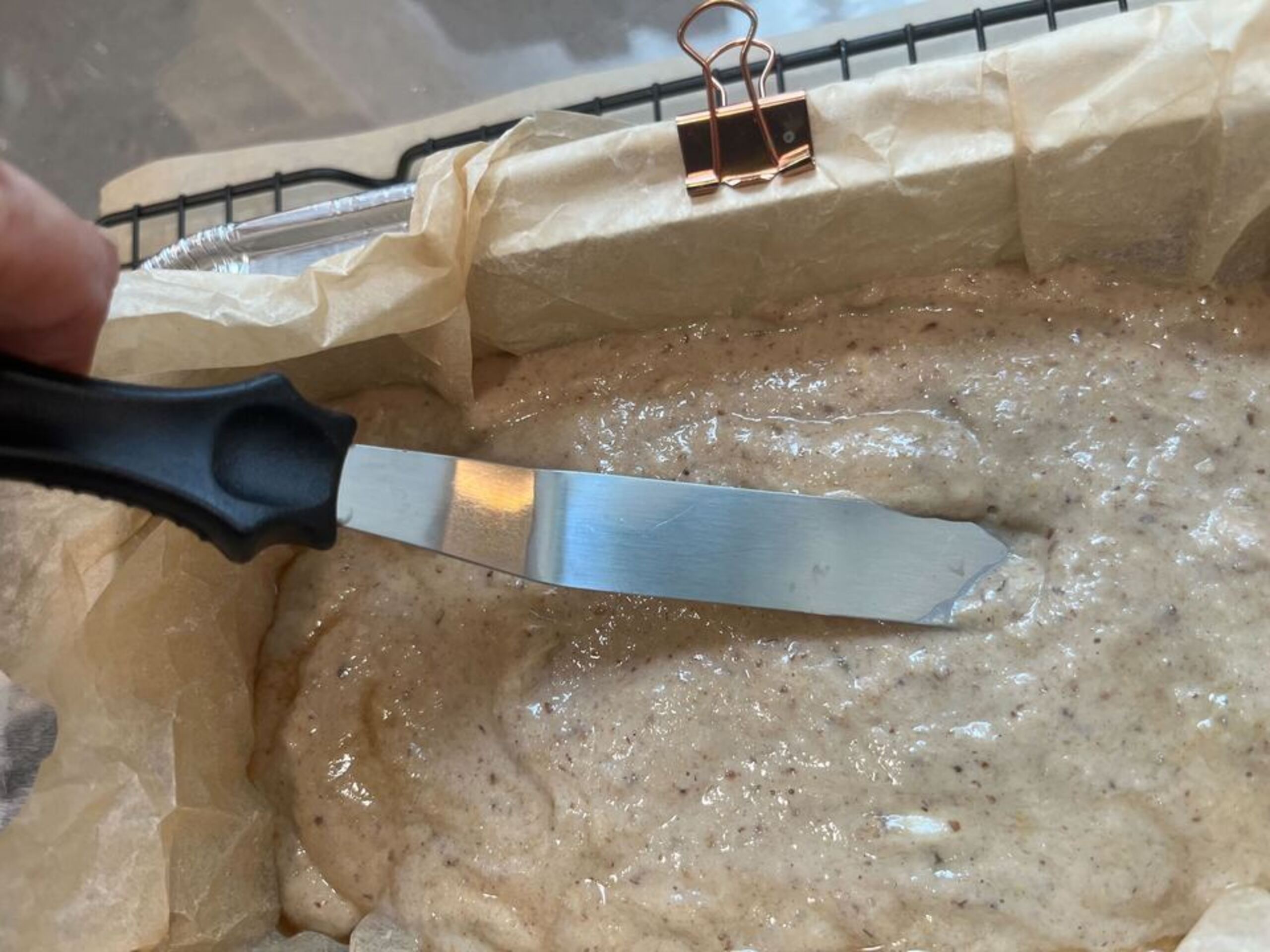 Pour batter into a parchment lined 9 × 2.75 inches loaf pan. Use an offset spatula to smooth out the top of the batter.