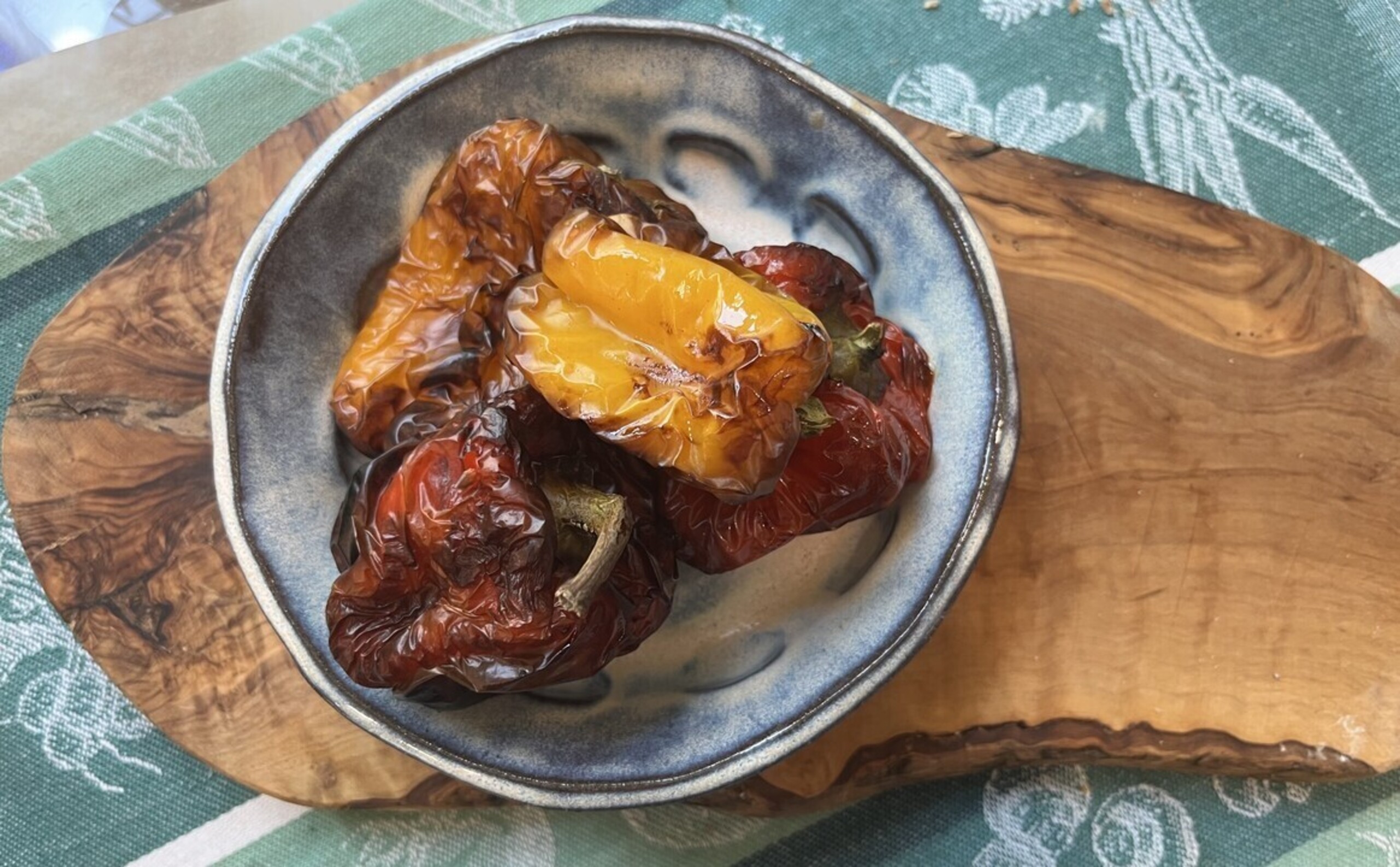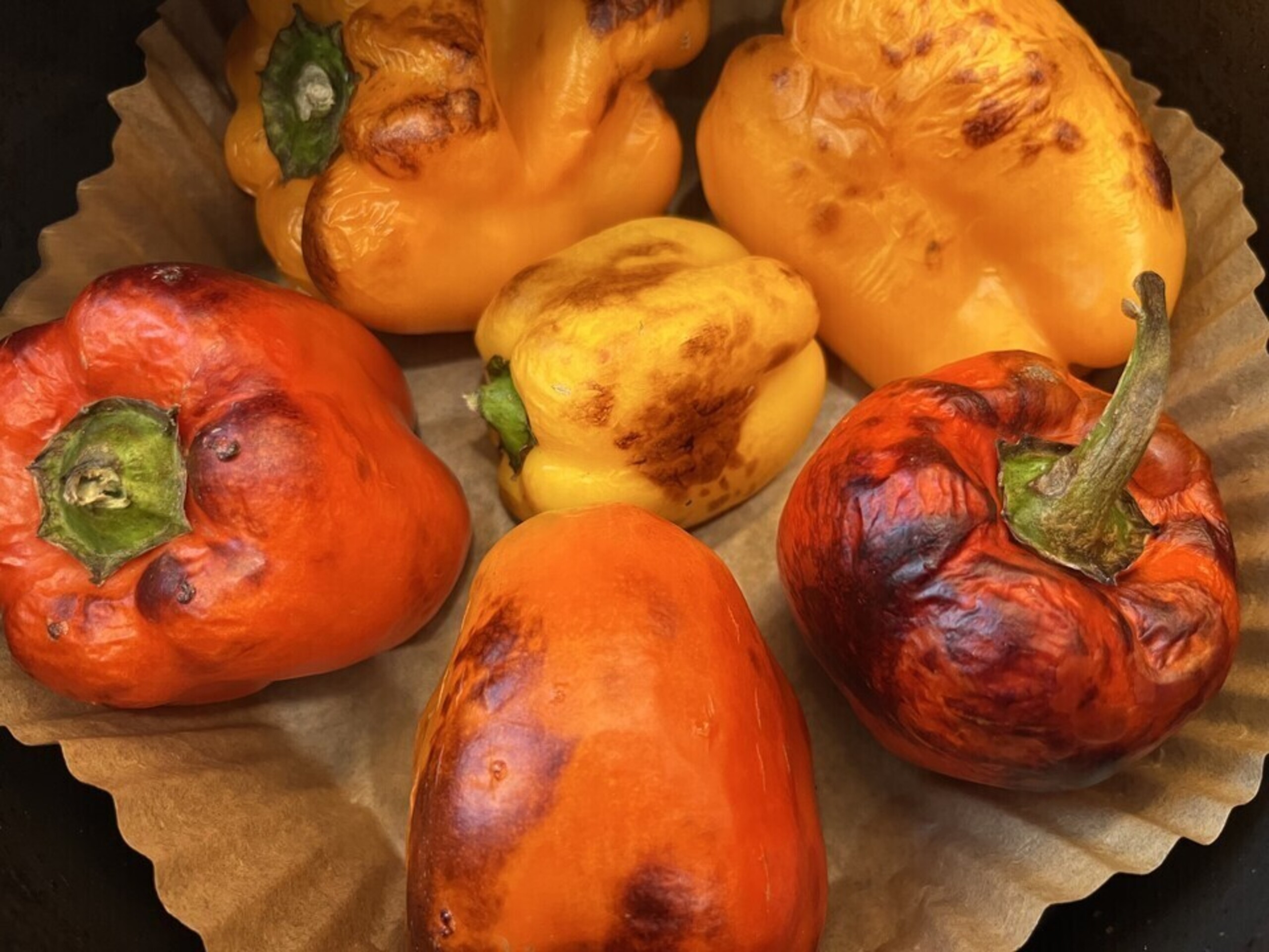 Remove from air fryer, place on a cooling rack. Cover with parchment paper or a kitchen cloth for about 10 minutes. This will allow the peppers to steam and make it easy to peel away the pepper skin.