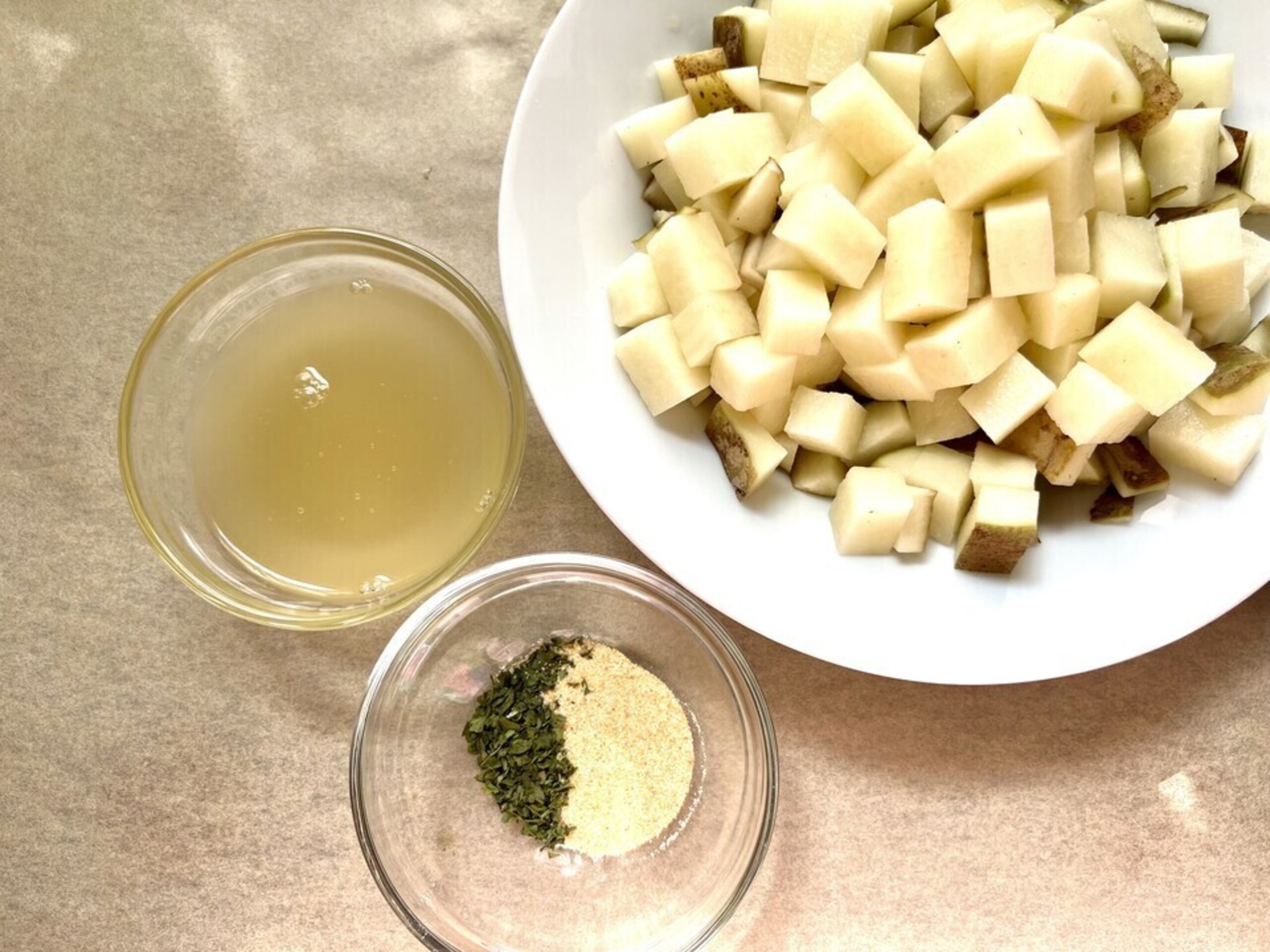 - Wash and dice potatoes into small, even-sized cubes (about ½ to ¾ inch).