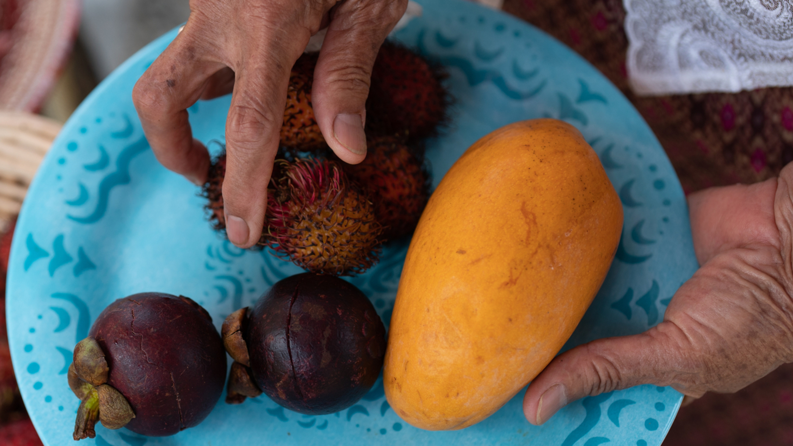 Drizzle a tablespoon of the nu ́ó ́c chǻm mixture over the mango and let it drip into the bowl, slightly pooling around the fruit.