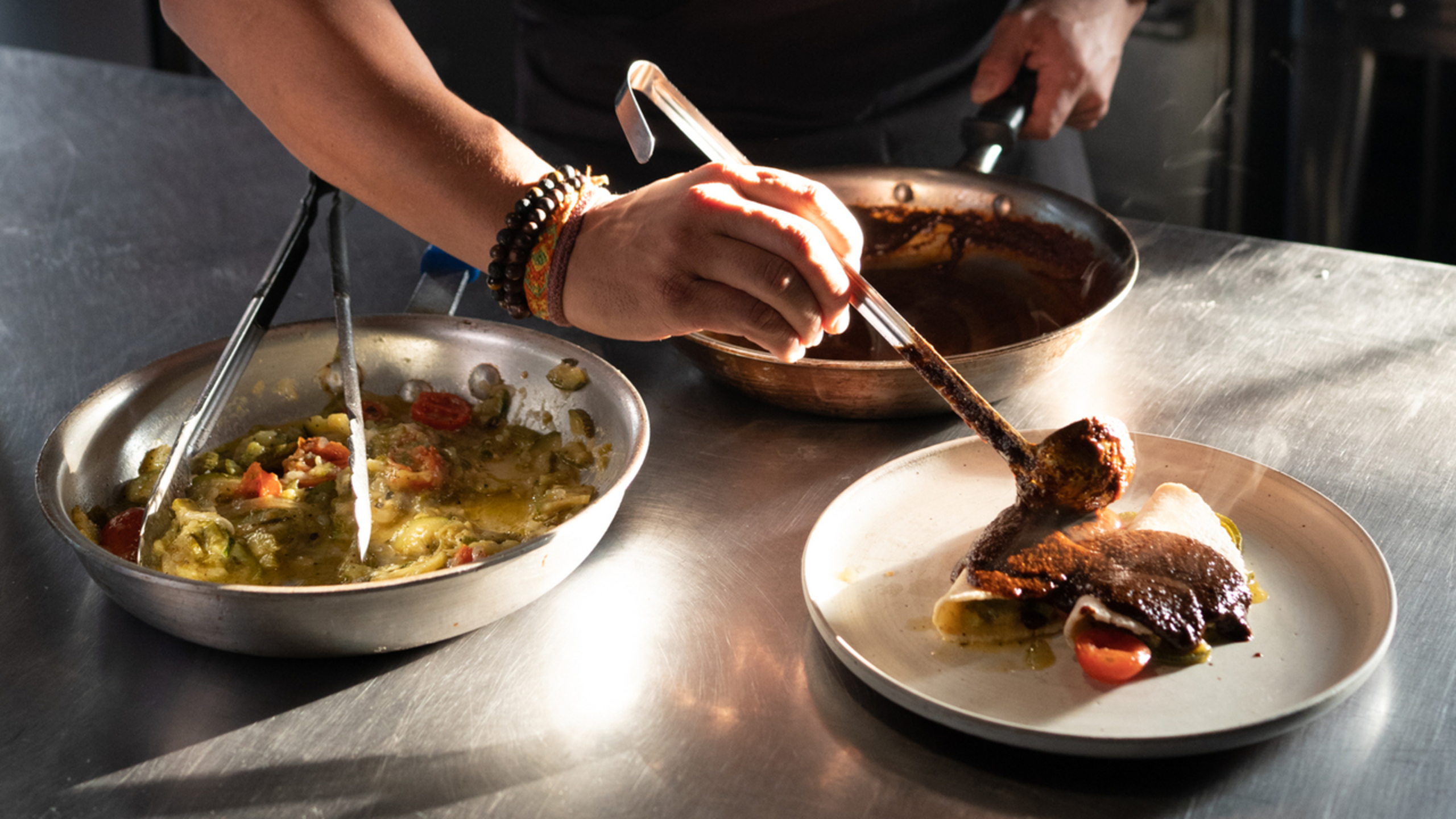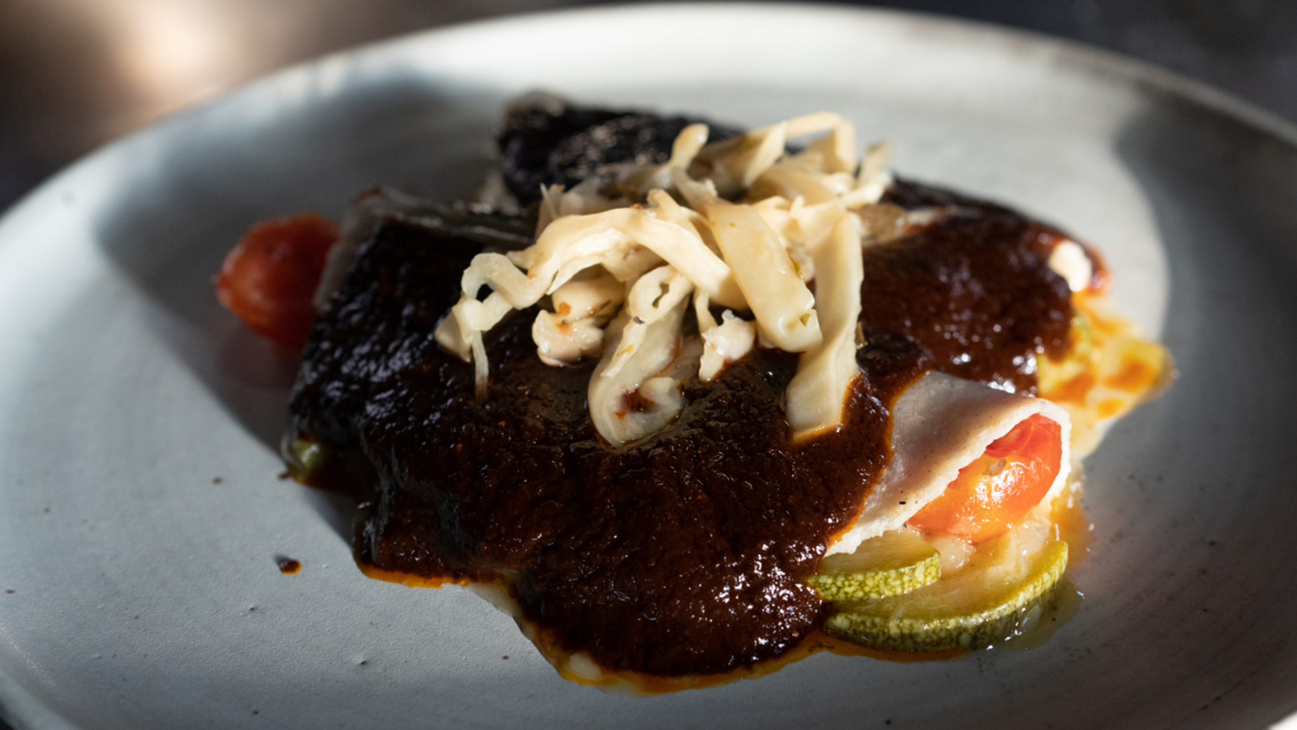 Spread a bit of the calabacitas on half of a tortilla and fold the other half over the filling. Repeat with the remaining tortillas. Spread the mole evenly across the enmoladas; you can go heavy on the mole and cover the tortillas, or you can put just a little bit of mole over them, depending on your preference.