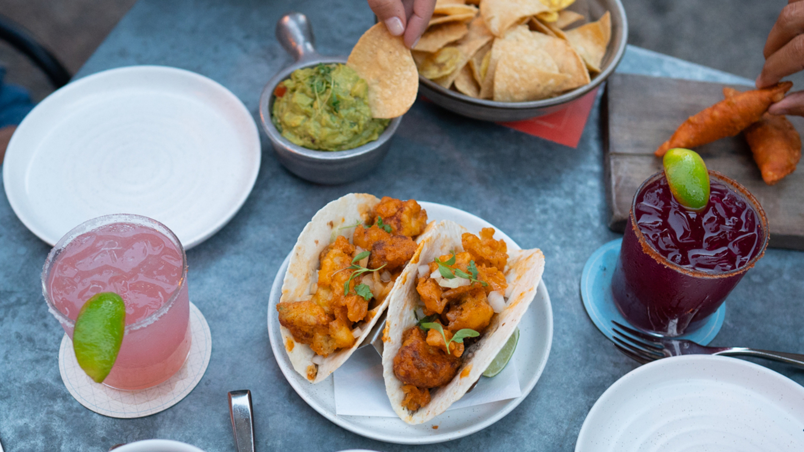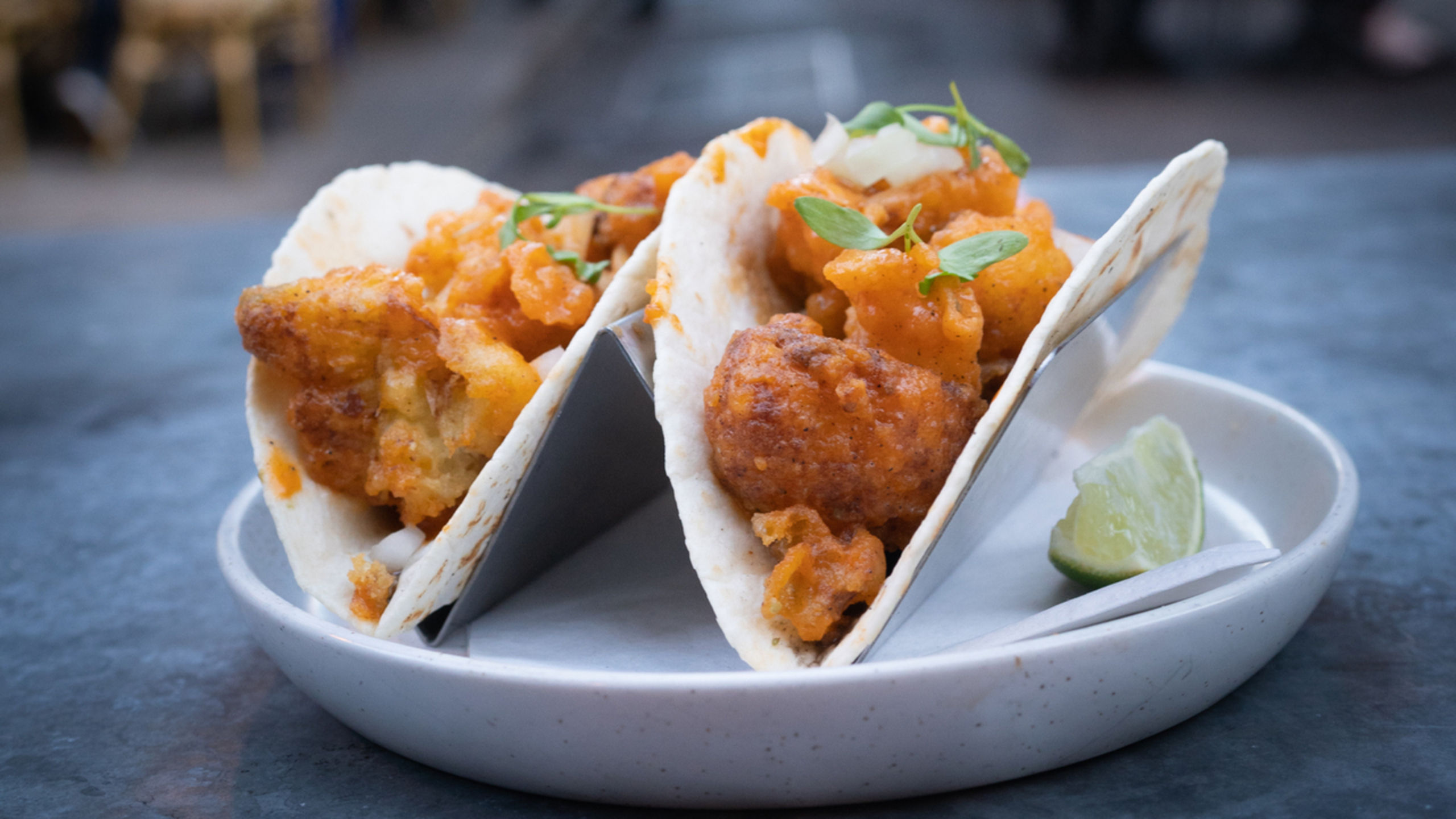 To make the tacos, warm the tortillas on a griddle or in a skillet. Then place a tortilla on a plate. Top it with some of the avocado, black beans, green goddess sauce, buffalo cauliflower, and, if using, the onion, micro cilantro, and a squeeze of lime juice. Repeat to make 8 tacos.