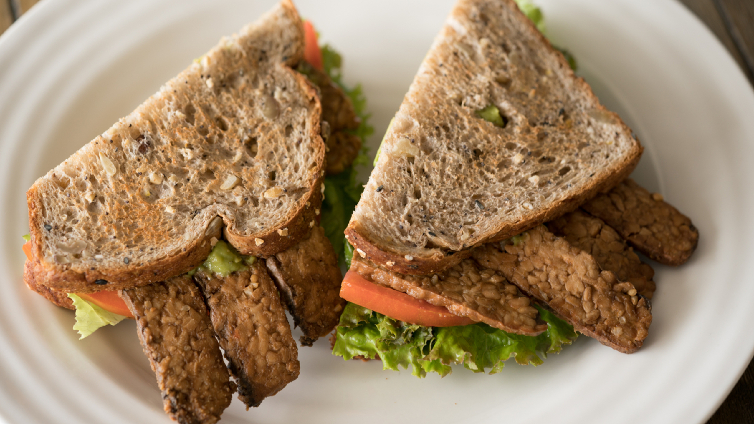 Assemble your sandwich: Toast bread (if desired) and slather with smashed avocado and hummus, mustard, or mayo. Top with tomato, greens, tempeh, and another dressed slice of bread.