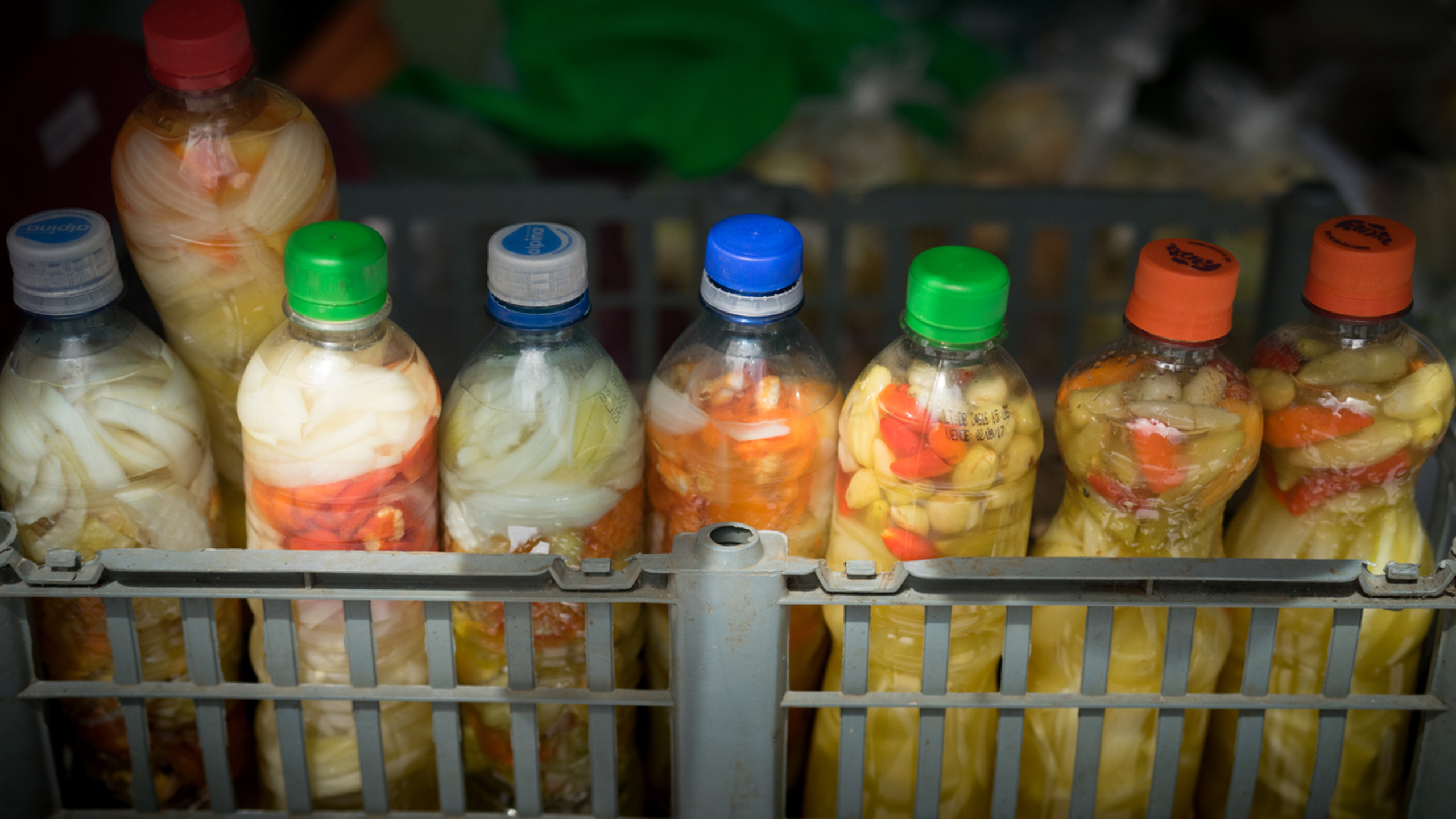 Fill clean wide-mouth glass pickling bottle(s) or jar(s) with vegetables; then pour vinegar into bottles, pushing down vegetables until vinegar covers them entirely.