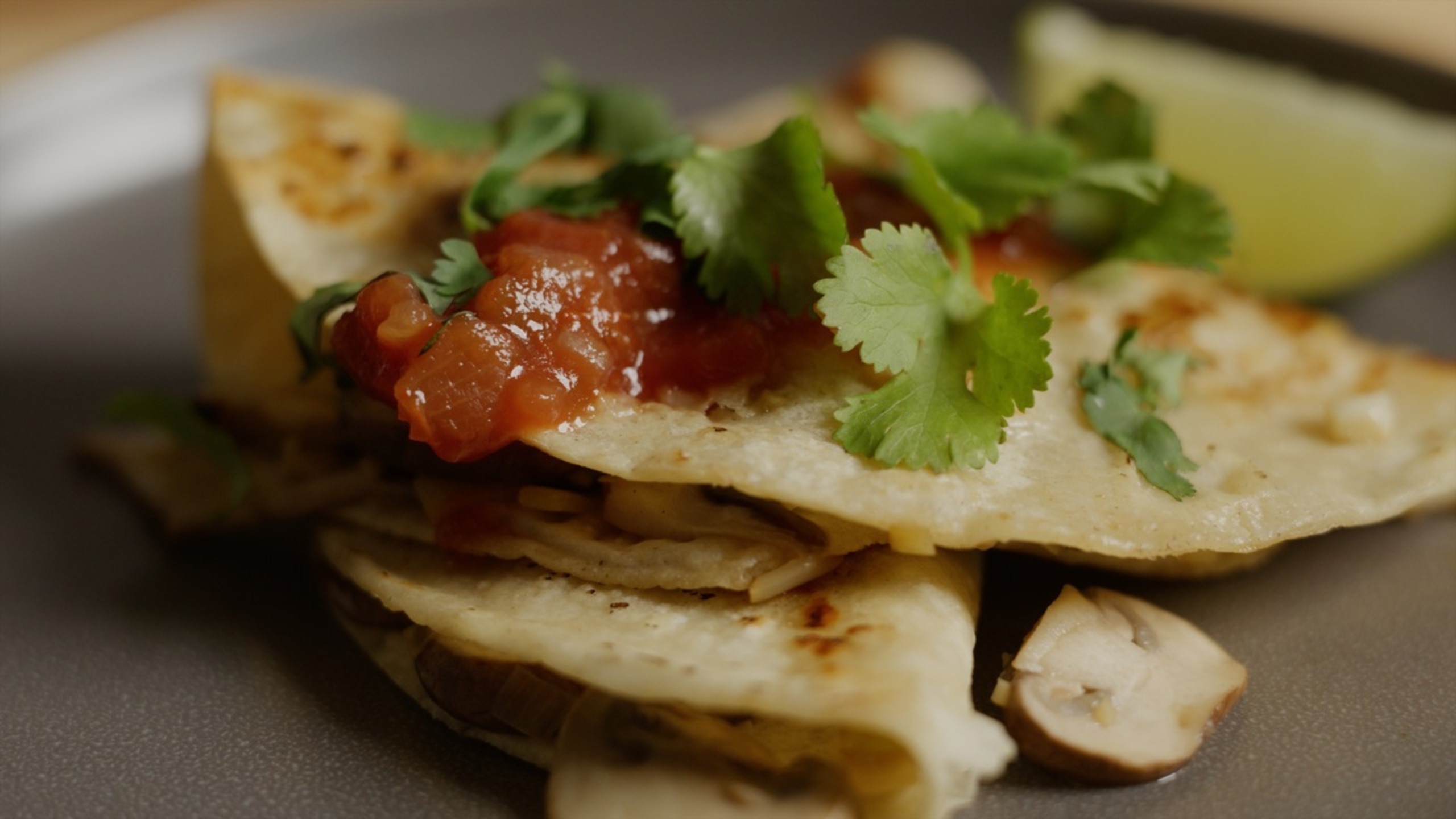 Place a couple of spoonfuls of the mushroom filling onto one half of each tortilla and fold the other half of the tortilla over the filling.