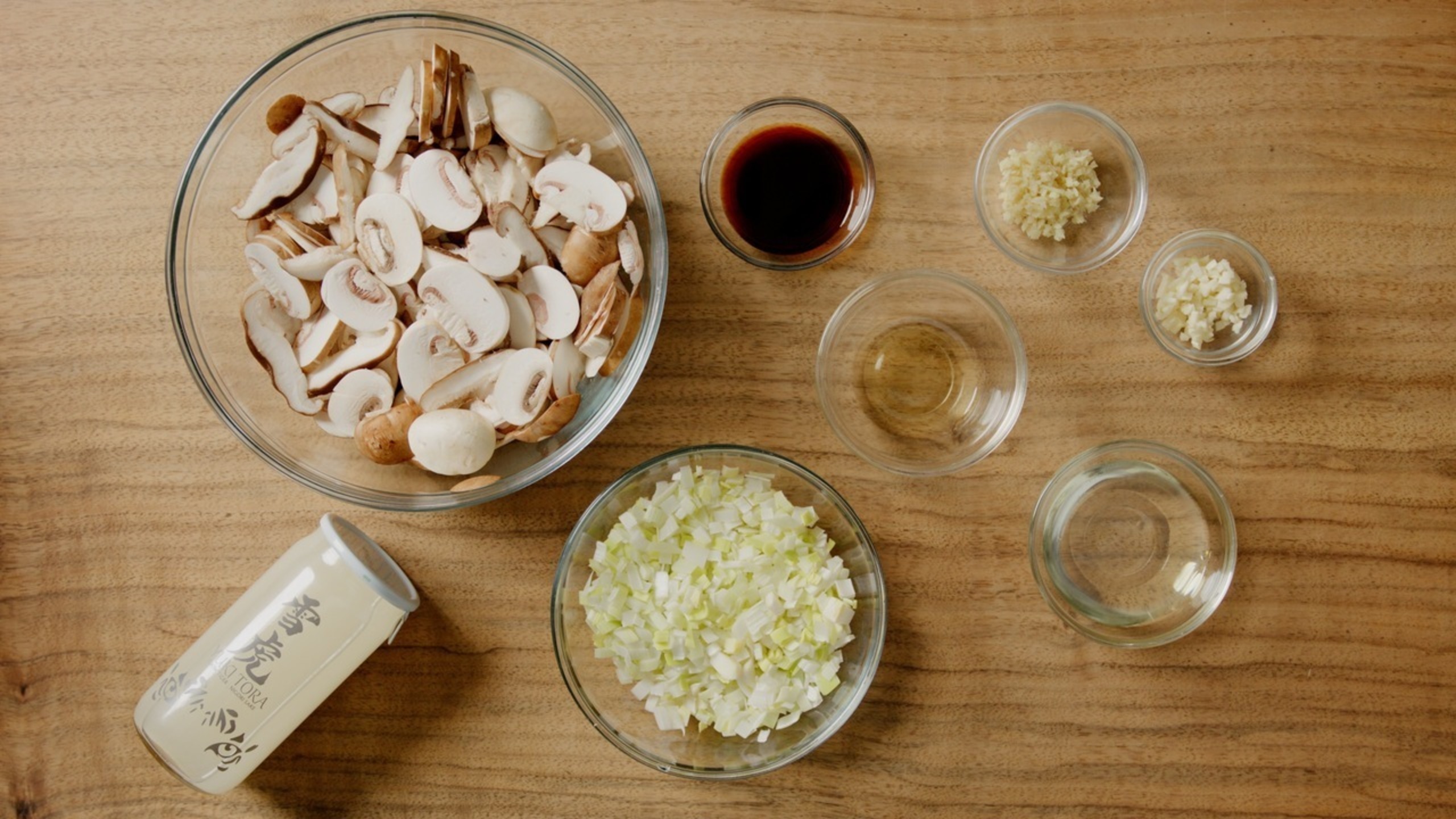 In a medium bowl, combine the sake and shoyu. Add the mushrooms and toss to coat. Let the mushrooms marinate for at least 1 hour.