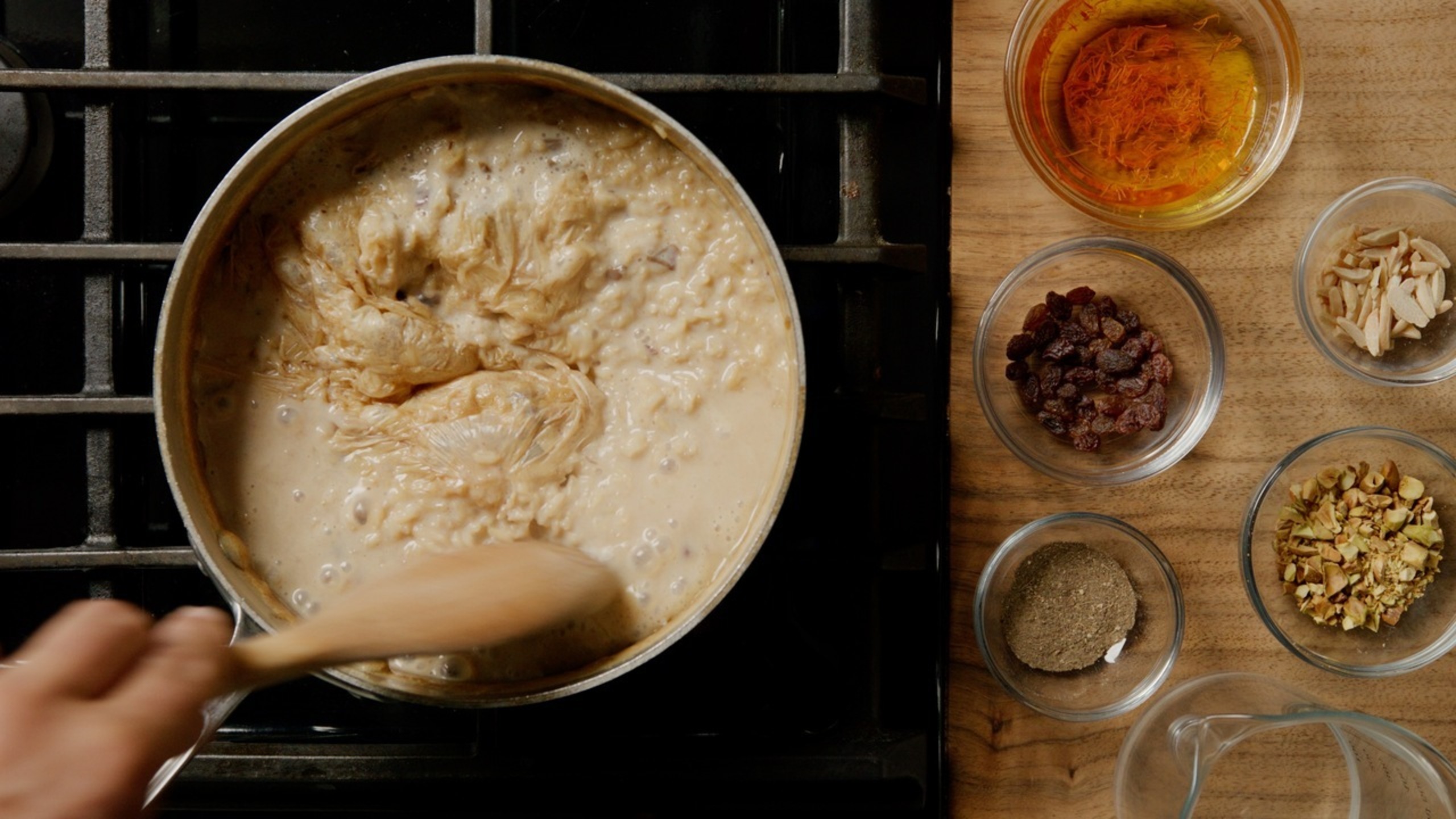 Add the saffron with its soaking liquid, the raisins, almonds, pistachios, cardamom, and the remaining 1⁄2 cup of room-temperature water to the pot with the cooked rice. Cook for 10 to 20 minutes more, stirring occasionally, until the rice is creamy.