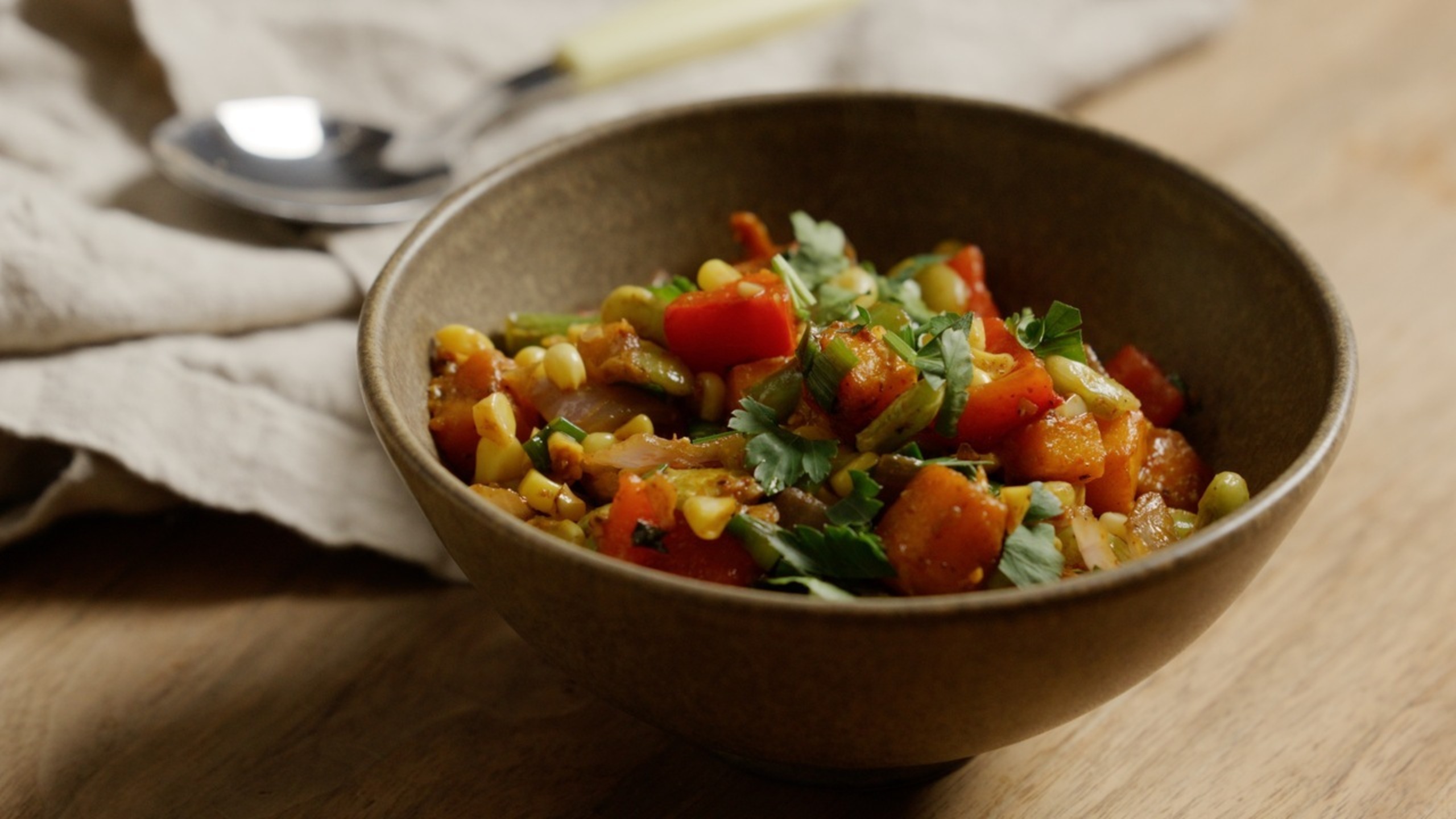 Add the red onion, red pepper, and green beans and cook, stirring occasionally, for about 2 minutes. Add the corn kernels and cook for 2 more minutes.