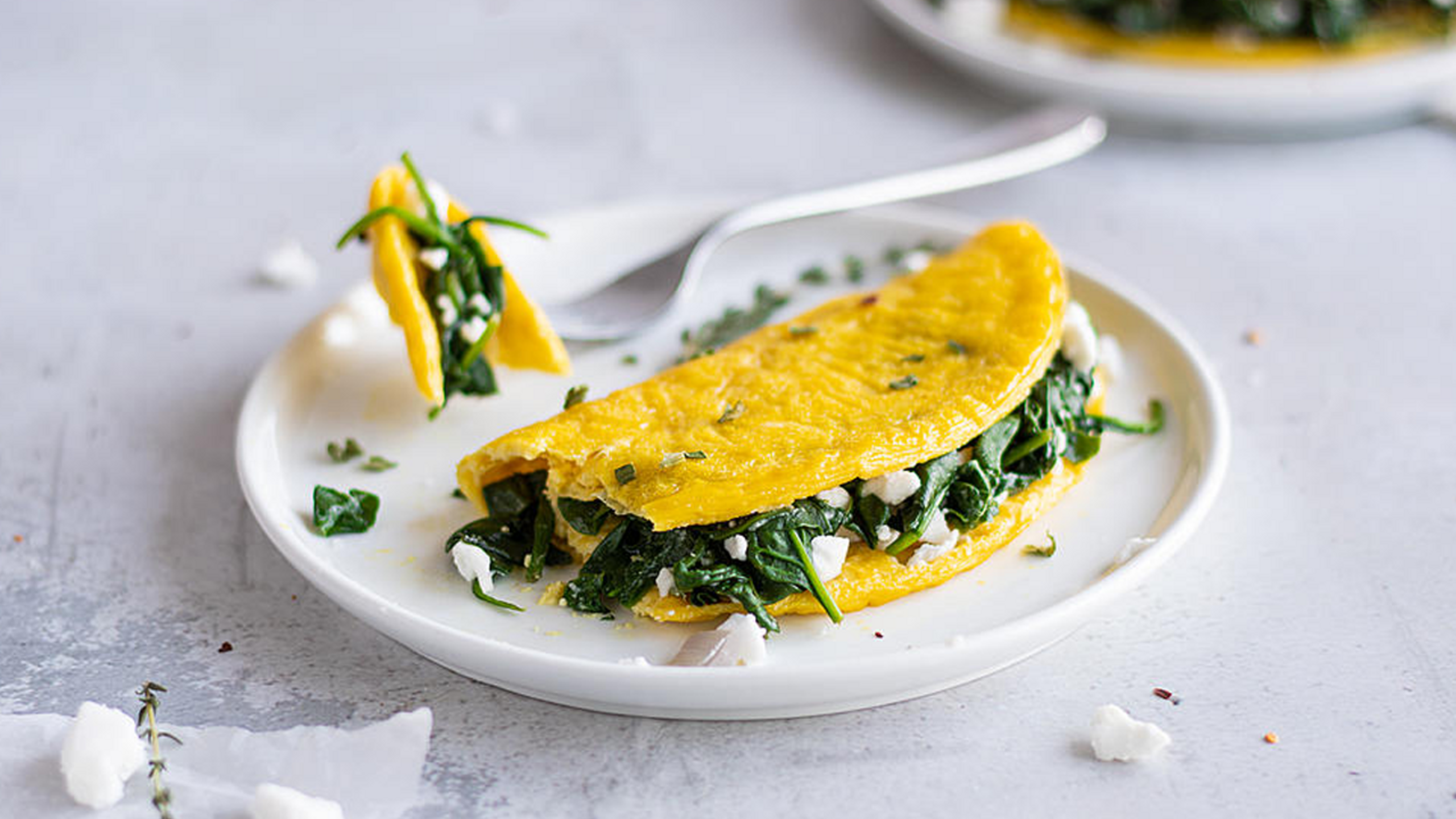 4. Once the edges begin to solidify, gently run your spatula around the edges to keep them from sticking. Once the bottom starts to solidify, you can slip the spatula underneath the omelet to gauge if it’s almost ready to flip. When the top has fully cooked, gently and quickly flip the omelet. Place 1⁄2 of the cheese on one side of the omelet, then the spinach mixture and then the remaining cheese.