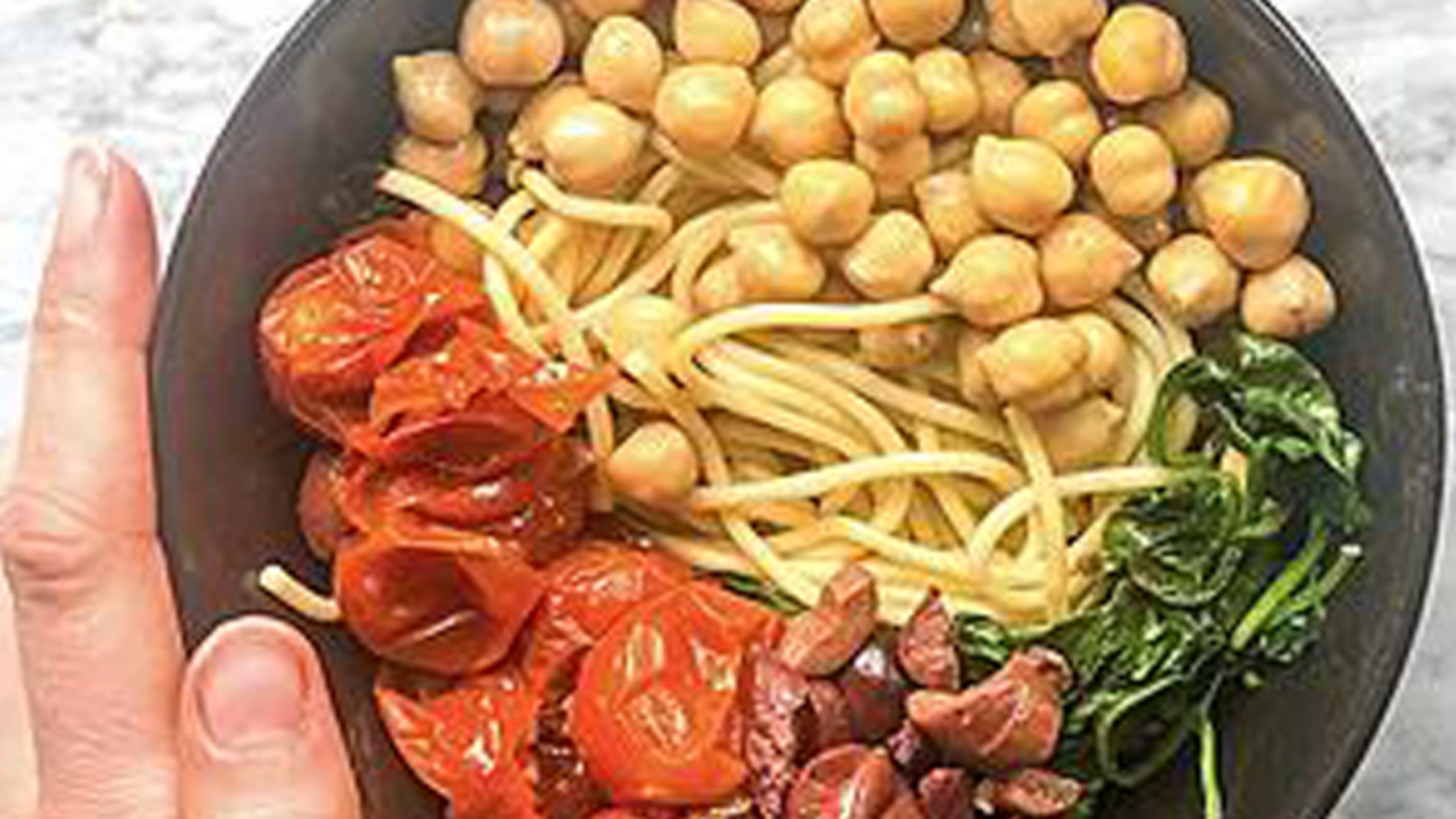 2. While the water boils and the pasta cooks, prep your veggies: mince the garlic, halve the cherry tomatoes and slice olives in half.
