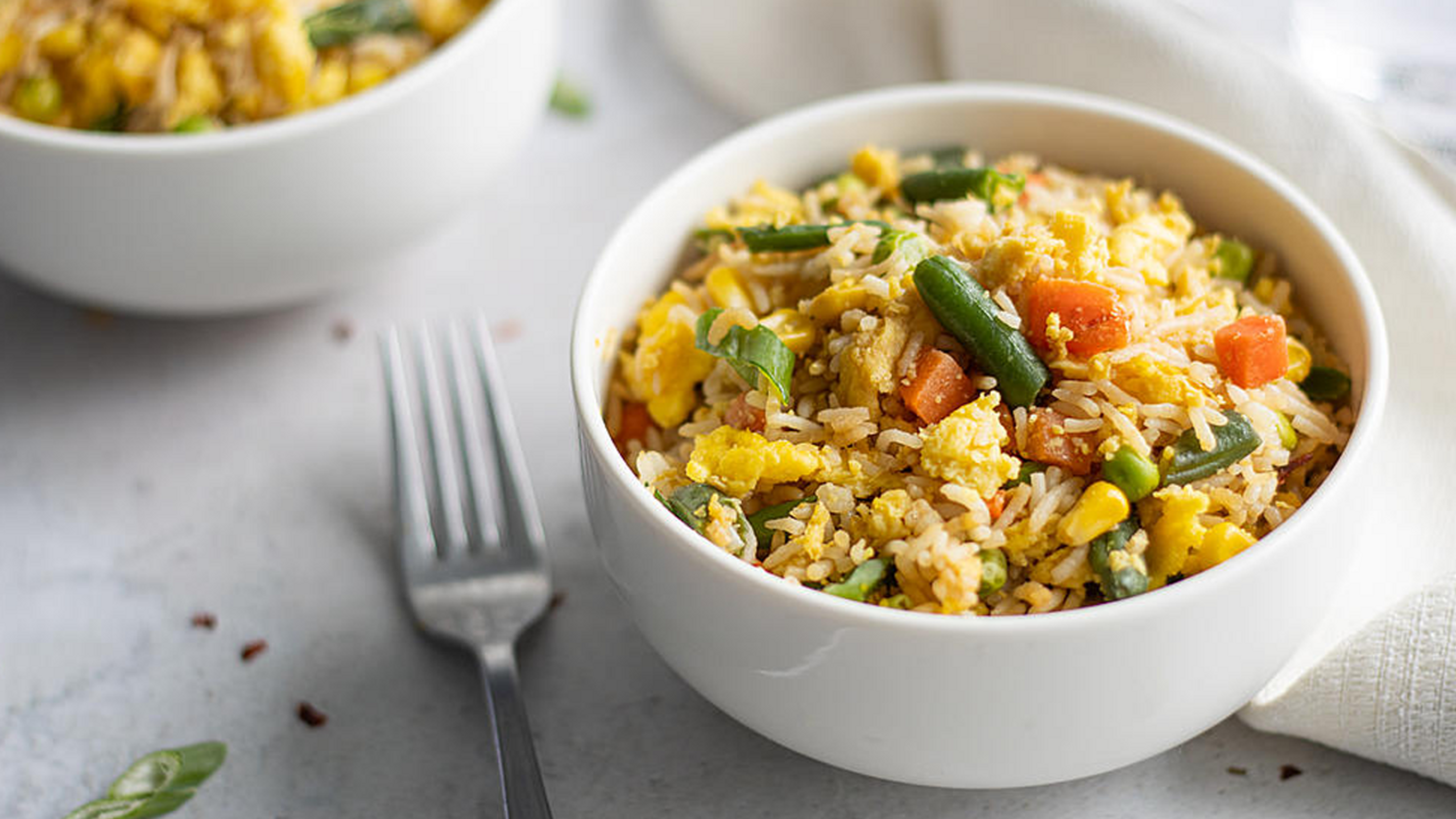4. Chop the folded and cooked JUST Egg into 1-inch pieces and add to the cooked jasmine rice.
