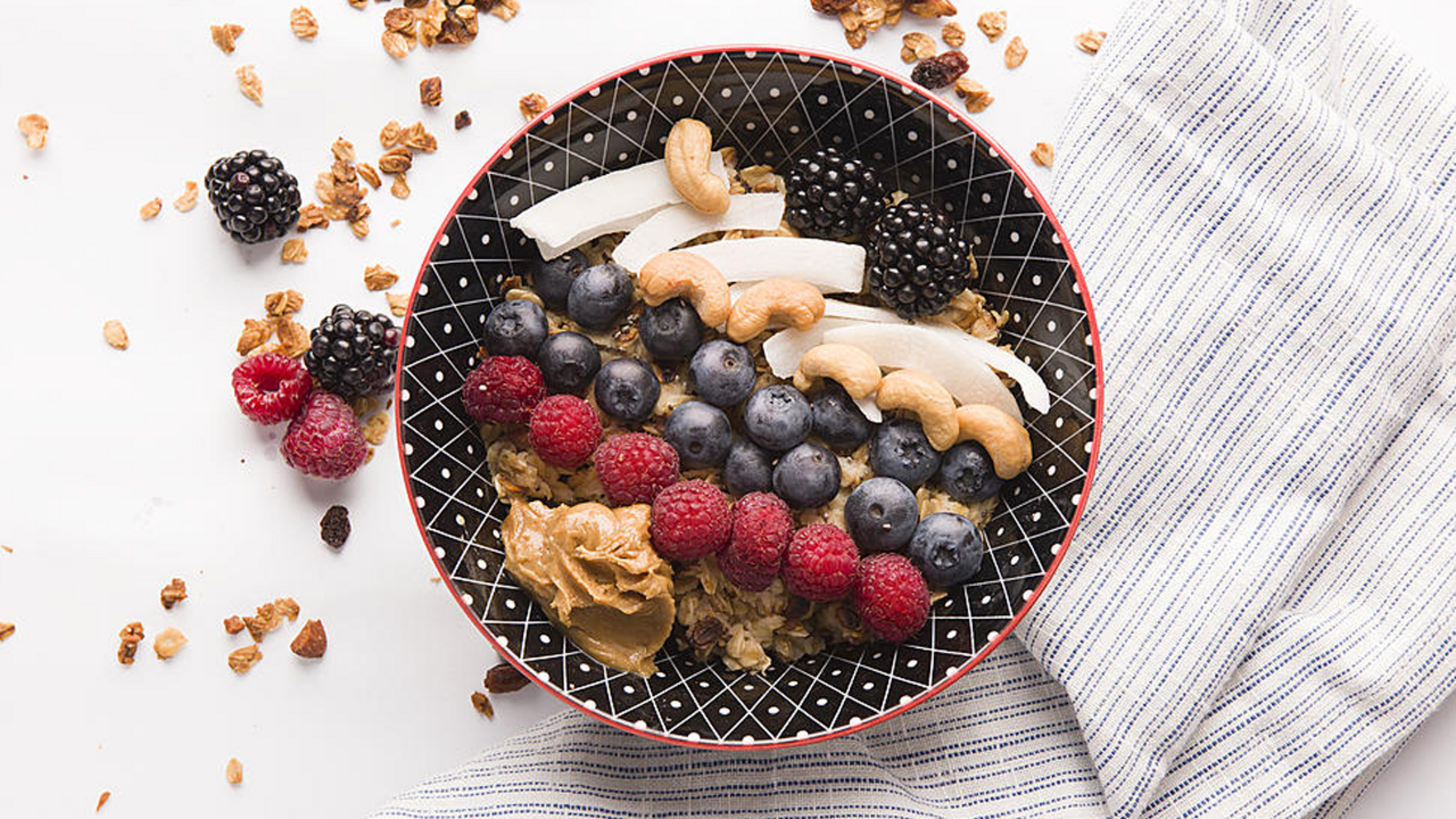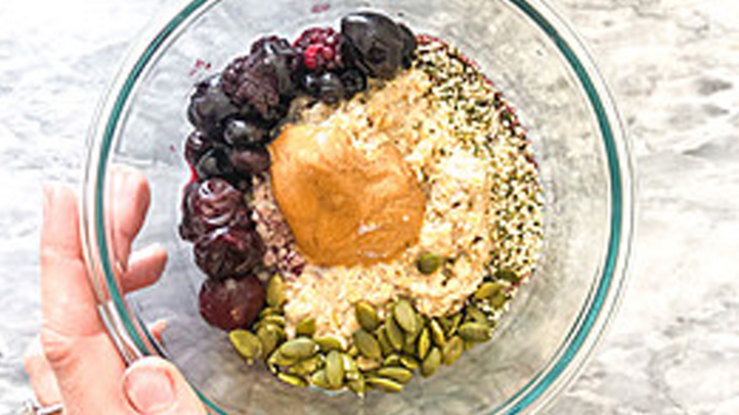 Wash berries and place in a bowl(s). Sprinkle berries with hemp seeds and pumpkin seeds. Top with almond butter and pour almond milk over top. Enjoy!