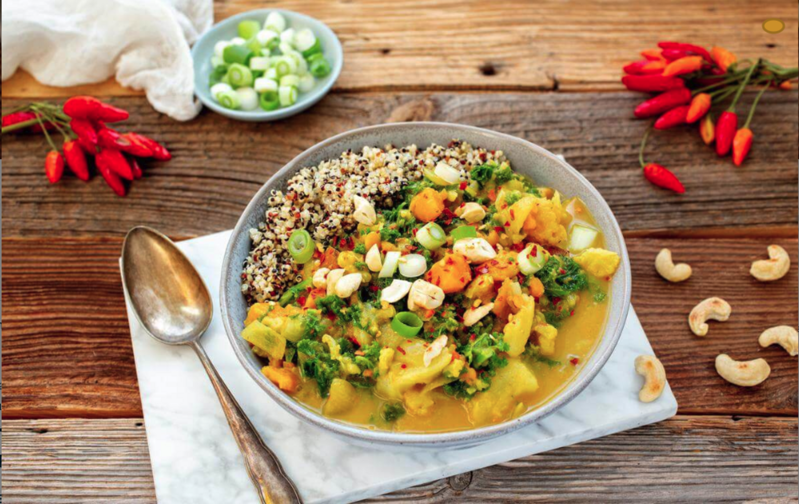 Serve soup over quinoa. Top each bowl with scallions, then sprinkle with cashews and pepper flakes, if desired.