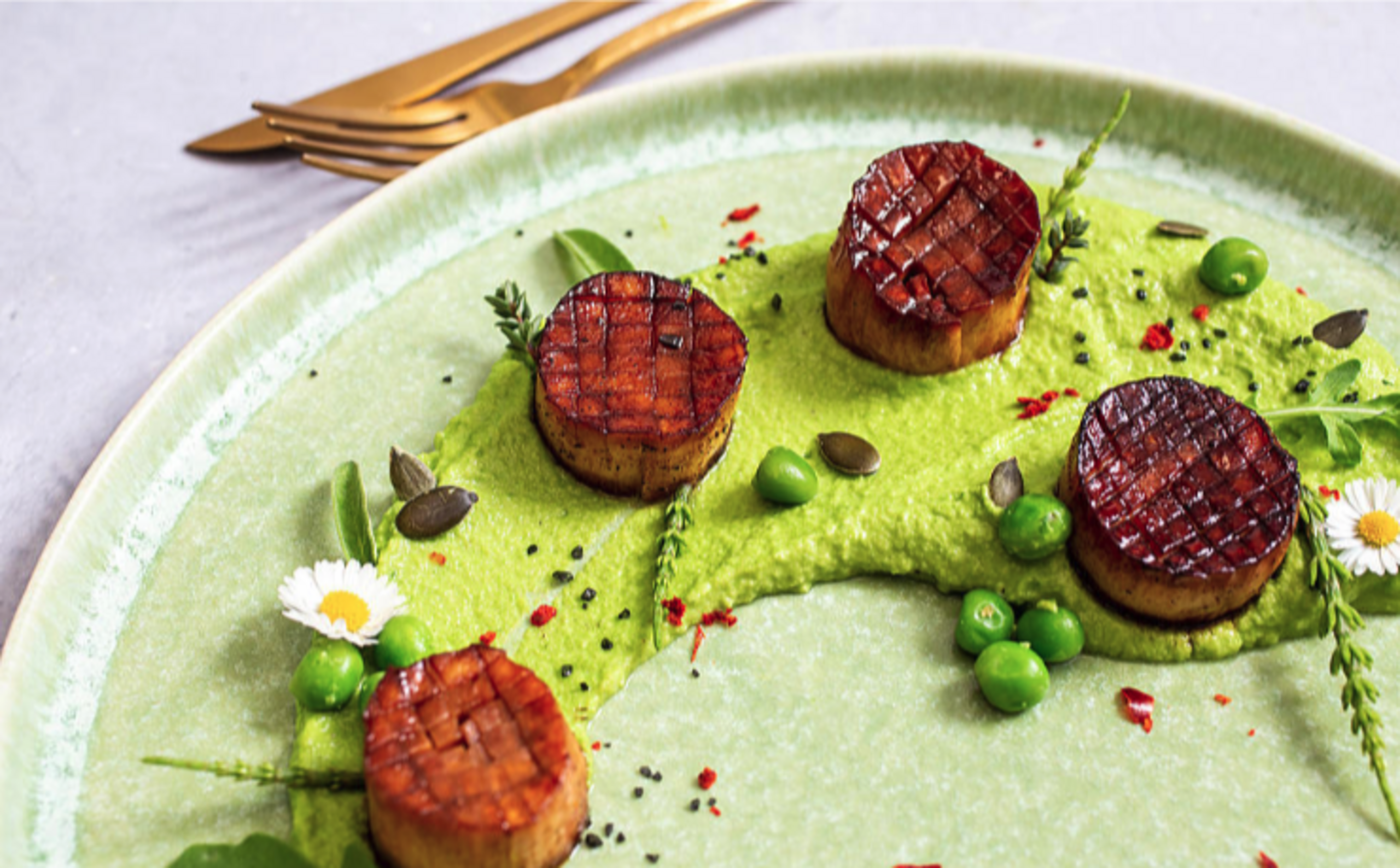 To serve spoon green pea puree onto a plate, then add scallops, and decorating elements.