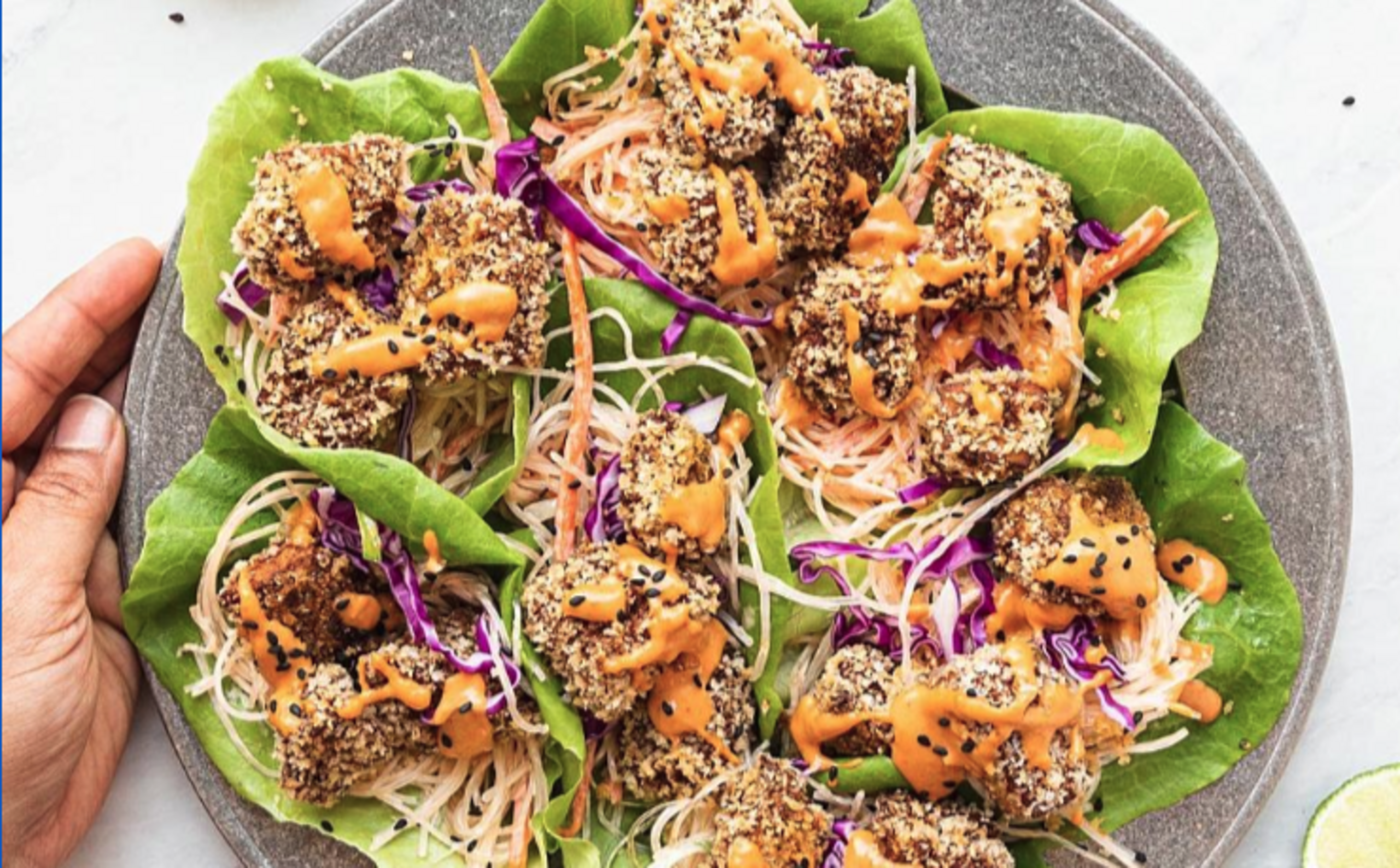 Place ¼ cup of slaw onto a lettuce leaf, top with 3 pieces of cooked crispy tofu, drizzle with peanut sauce.