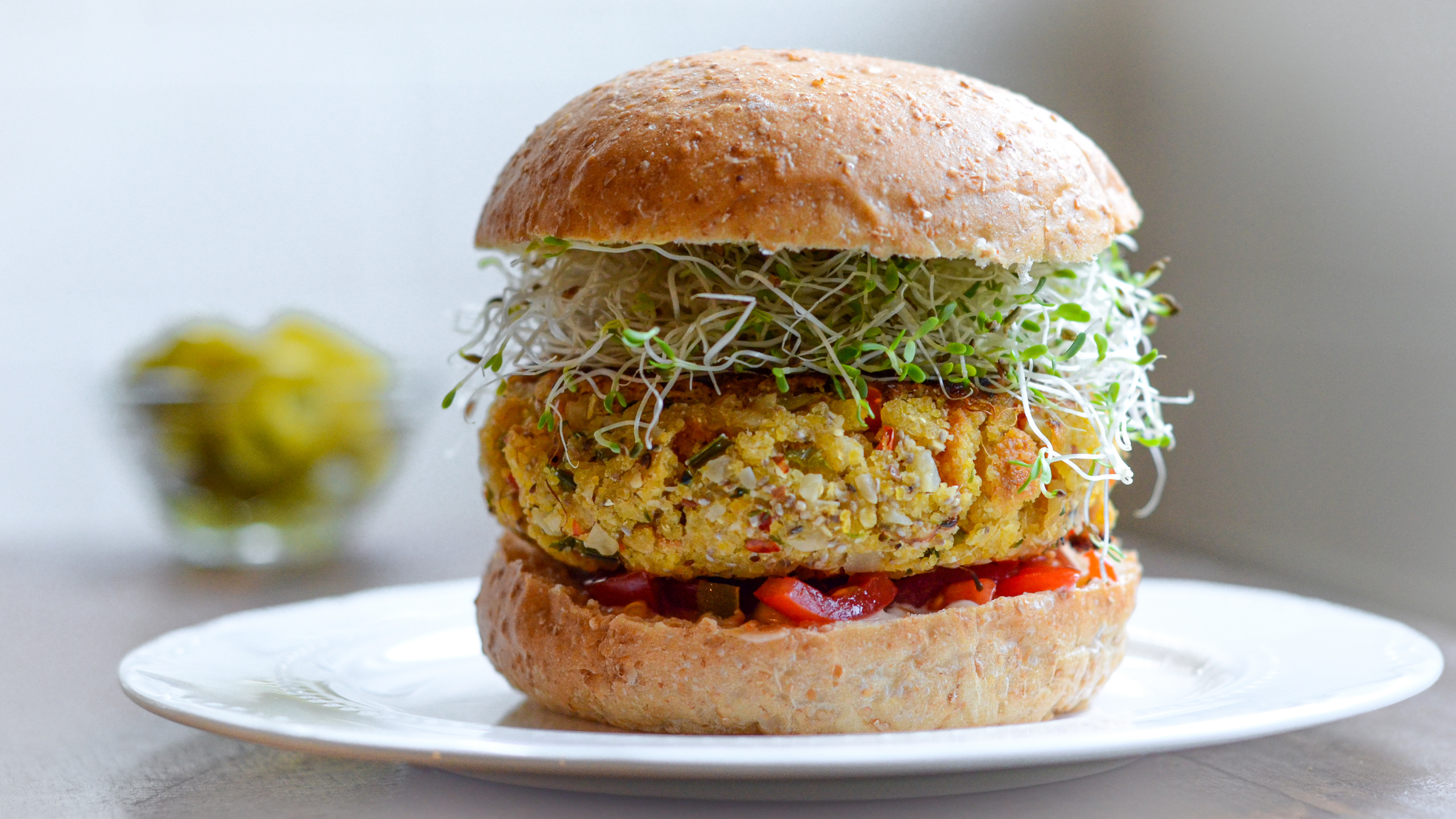 *Note: While the toppings are ultimately up to you, this particular combination really does add to the final result. We typically top these burgers with pickled jalapeños, Dijon mustard, salsa, and a big bunch of alfalfa sprouts.