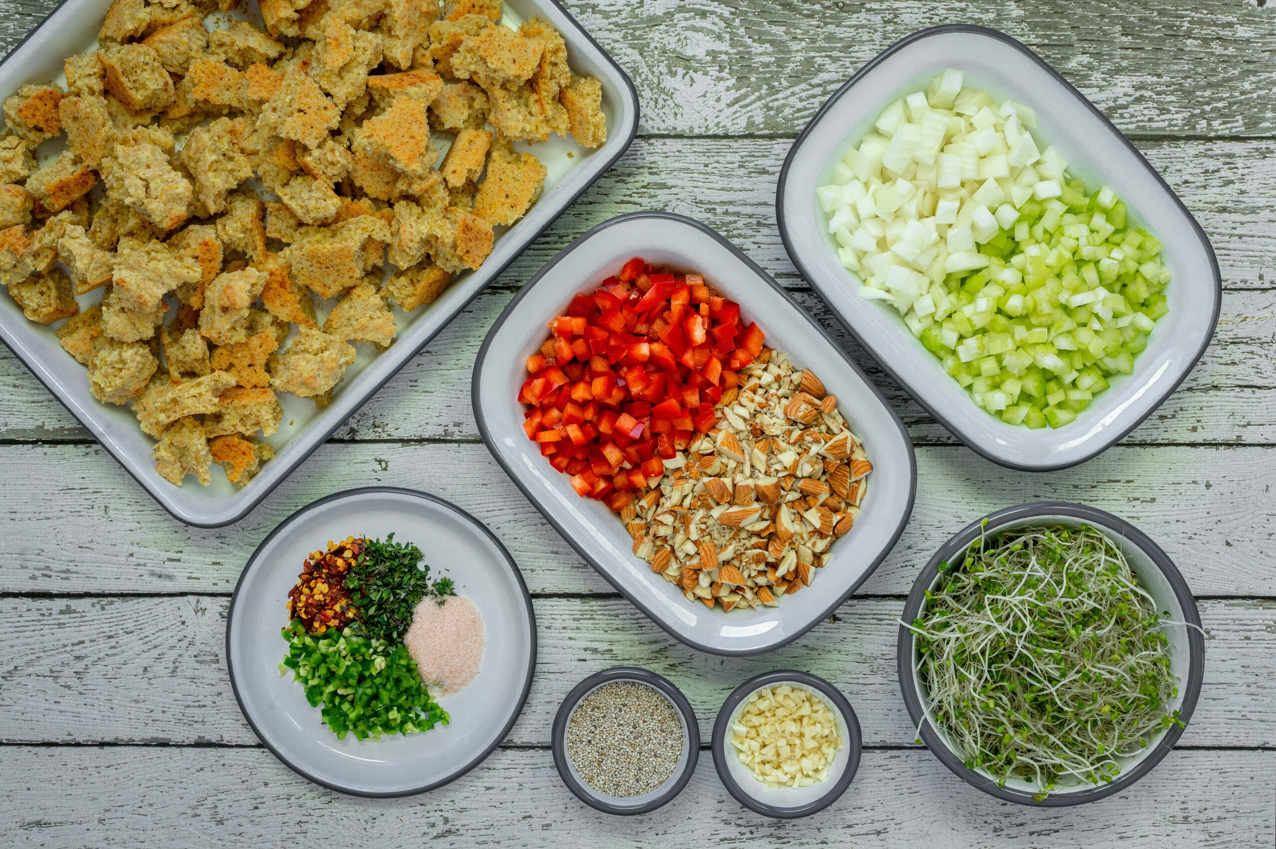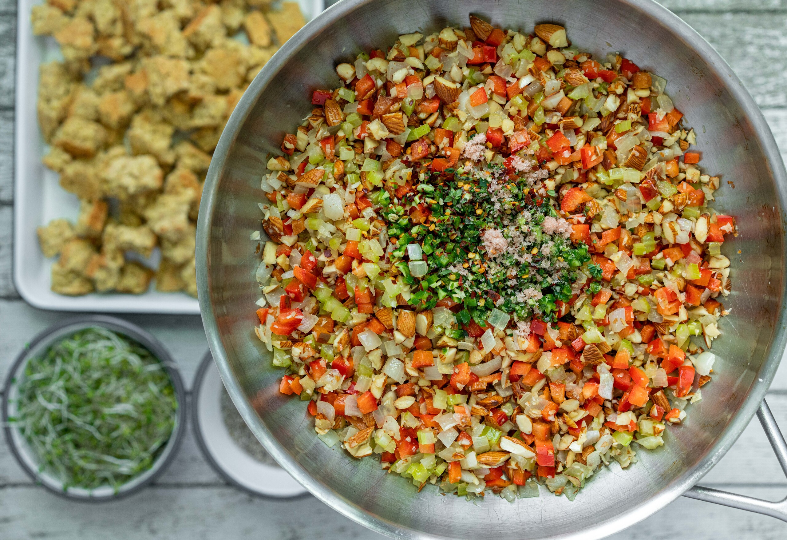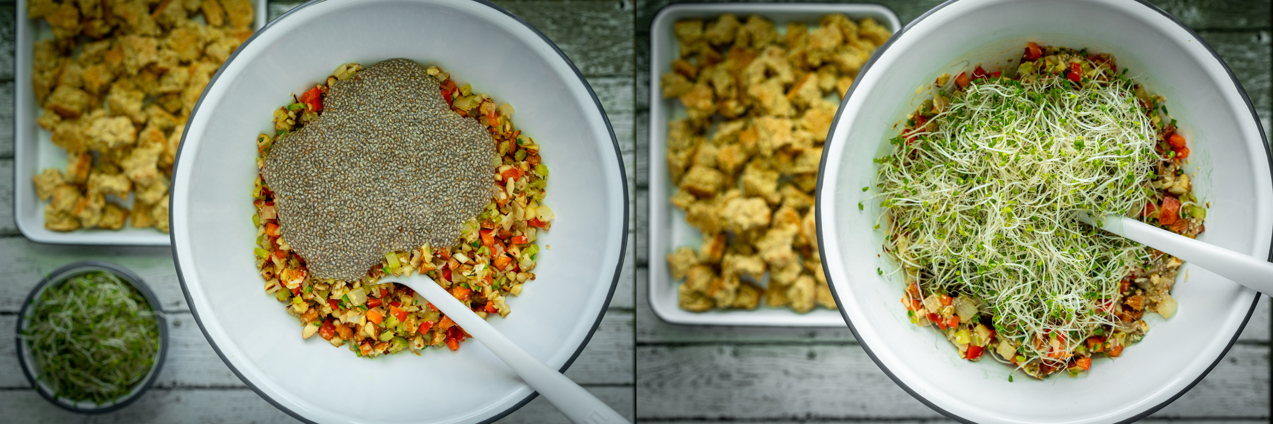 Pour everything into a large bowl and add the chia/water mixture. Mix well to combine. Then add the alfalfa sprouts and mix again. Lastly, add the cornbread and mix well. Taste for seasoning, adding more salt and/or chili flakes as desired.
