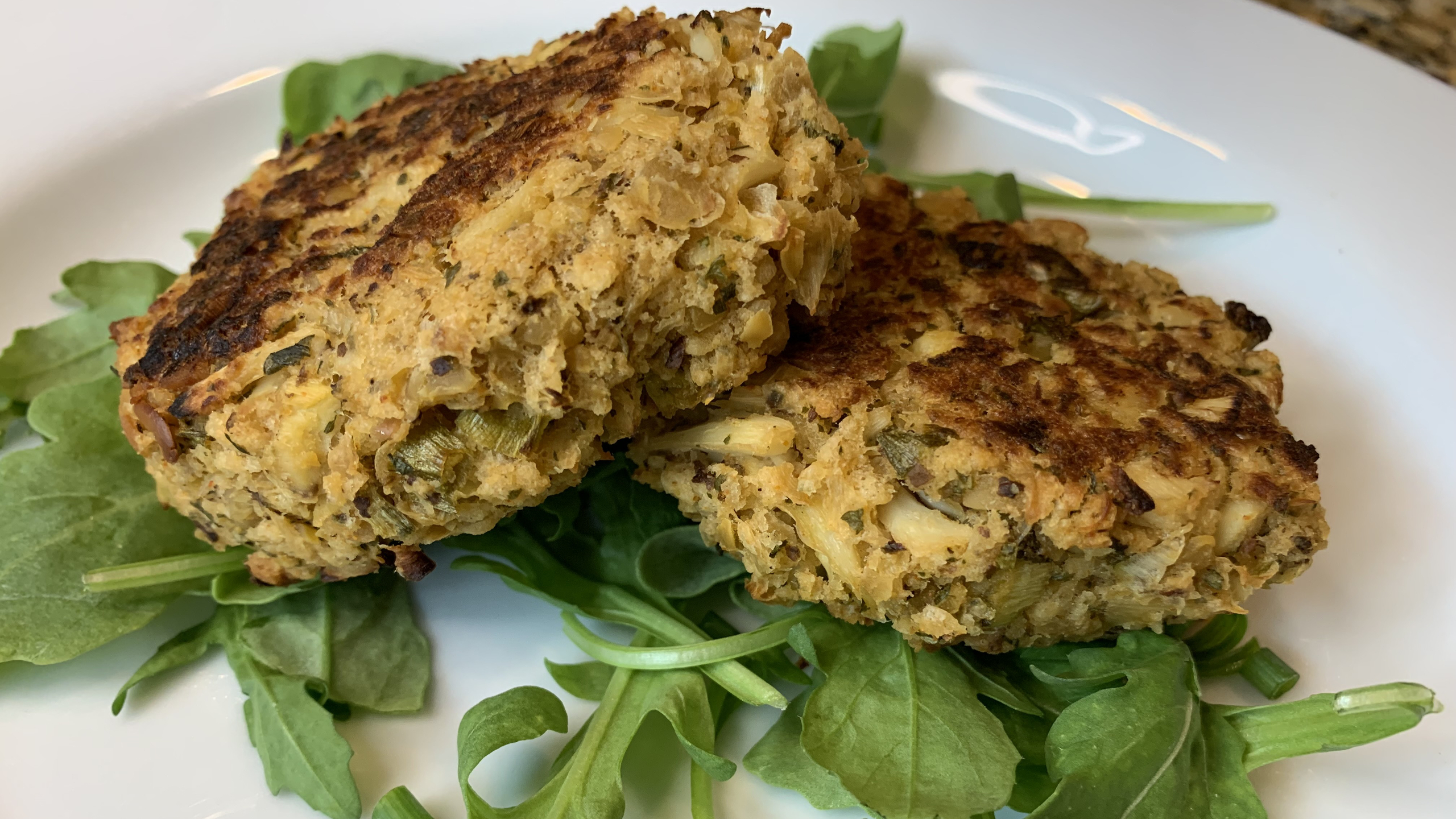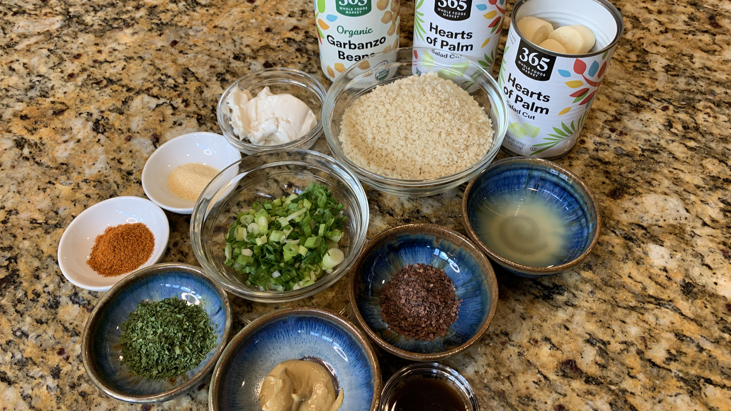 Add the bread crumbs, green onion, and hearts of palm and garbanzo bean mixture to the liquid and mix by hand until combined.
