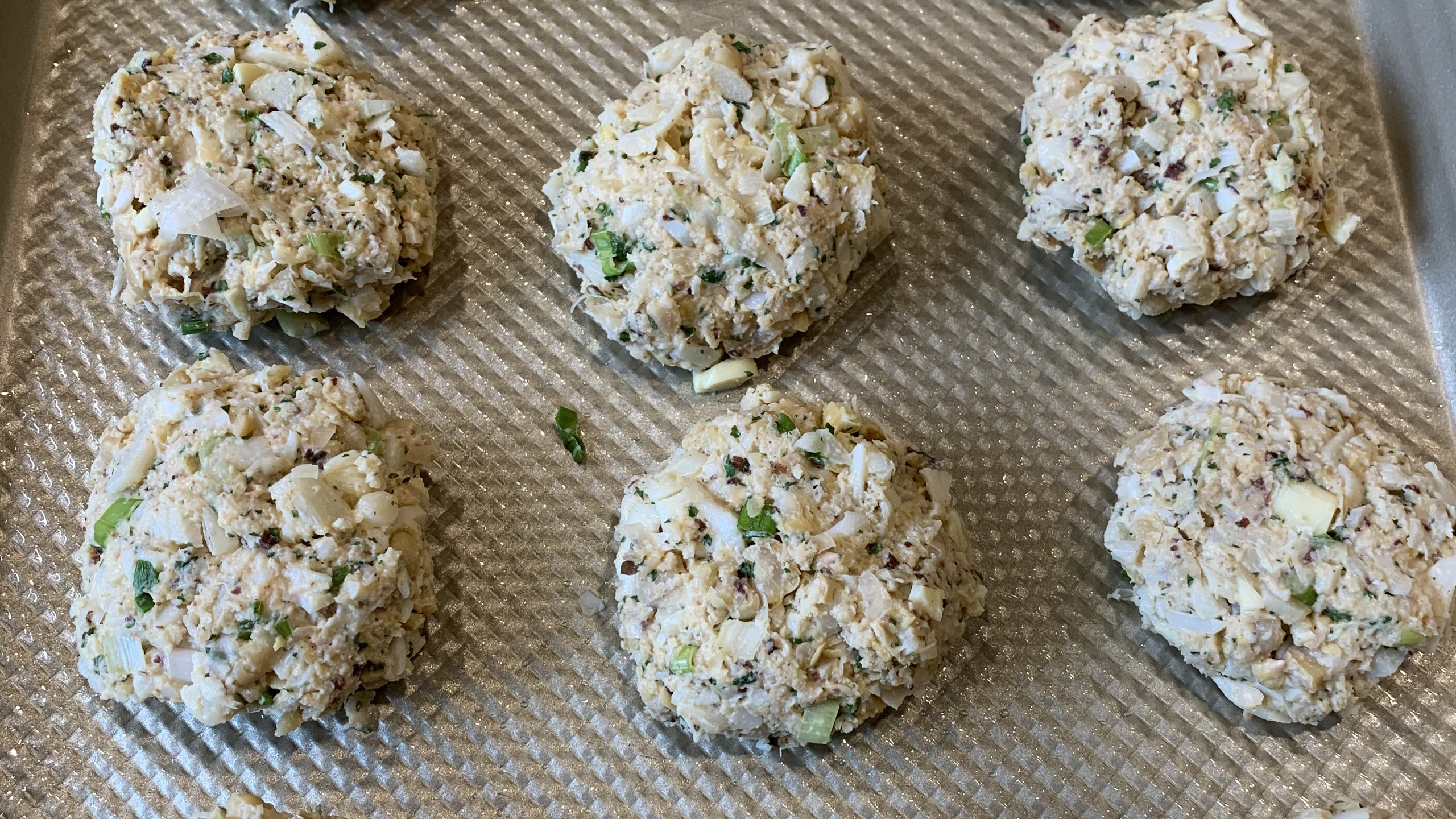 Form the mixture into approximate 3 inch patties and place on a sheet pan (I usually do it on a dry sheet pan, but you can also spray with a light coat of oil if your desire a crispier edge). Leave at least 1 inch between the patties to make sure they are heated evenly.