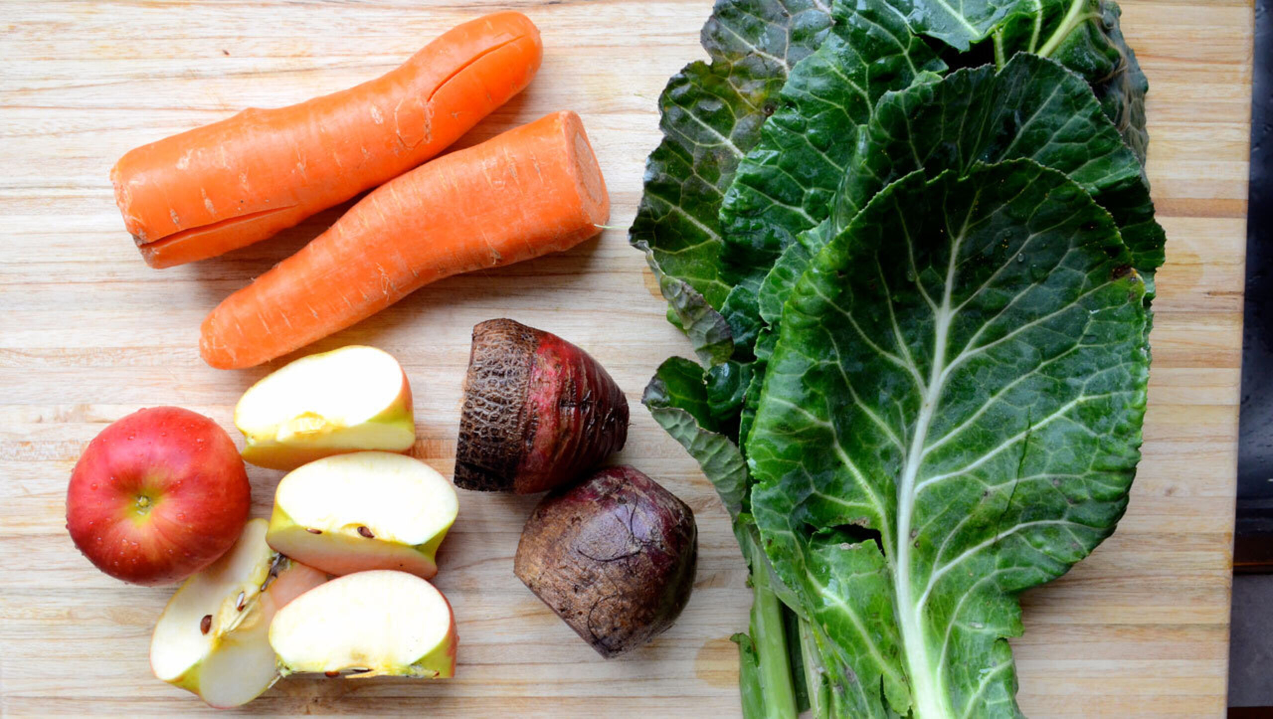 To prepare the juice, wash all of the ingredients. Cut the ends off of the beets and cut smaller, if needed. If they will fit through your juicer, then there is no need to cut them smaller.