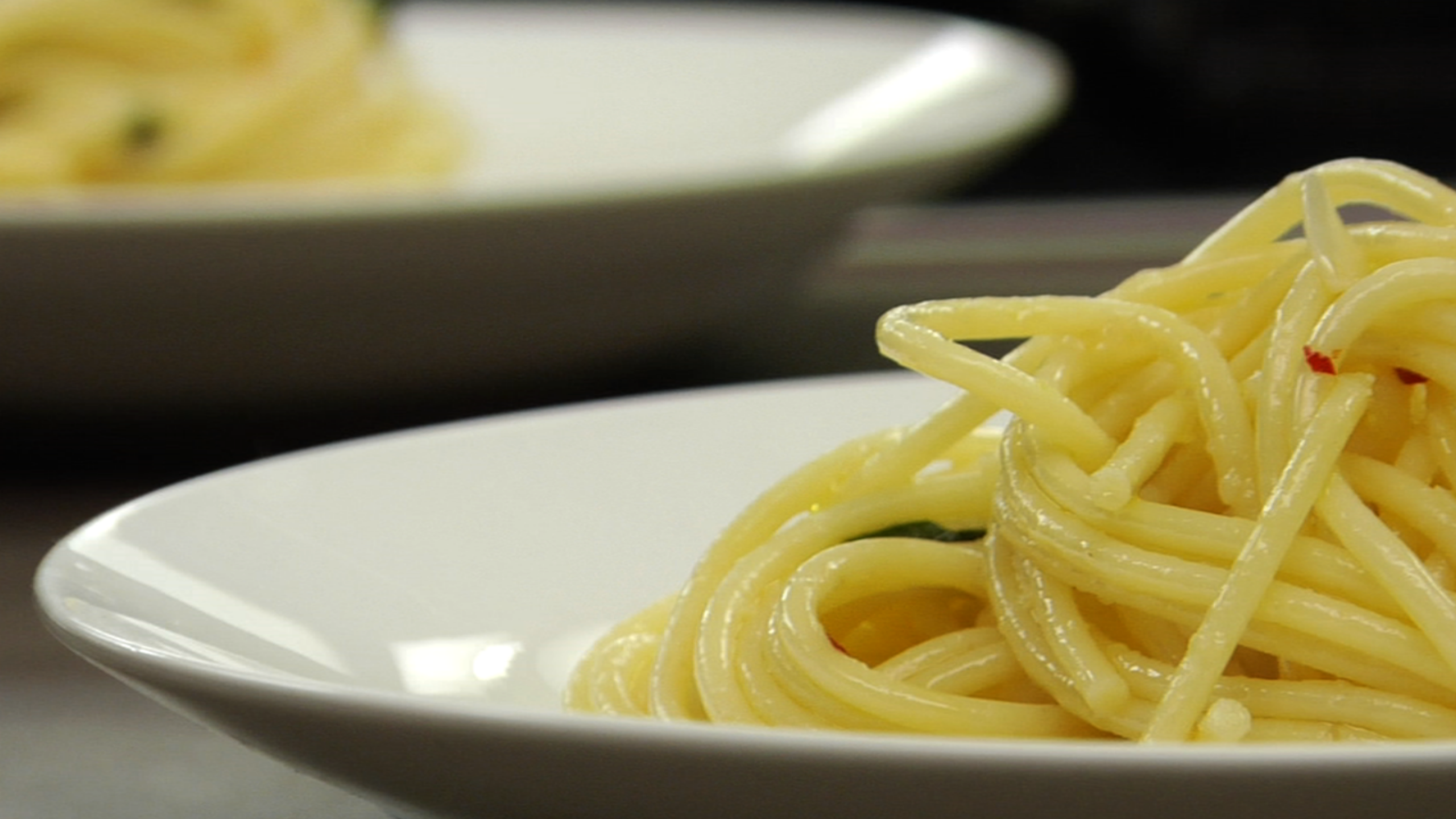 While the pasta cooks, turn the heat to medium and let the garlic and chilies slowly cook. Spread the garlic out slightly so it cooks evenly, but be careful not to spread it out too much or it could easily burn. As soon as the garlic starts to sizzle and soften, remove it from the heat until the pasta finishes cooking.
