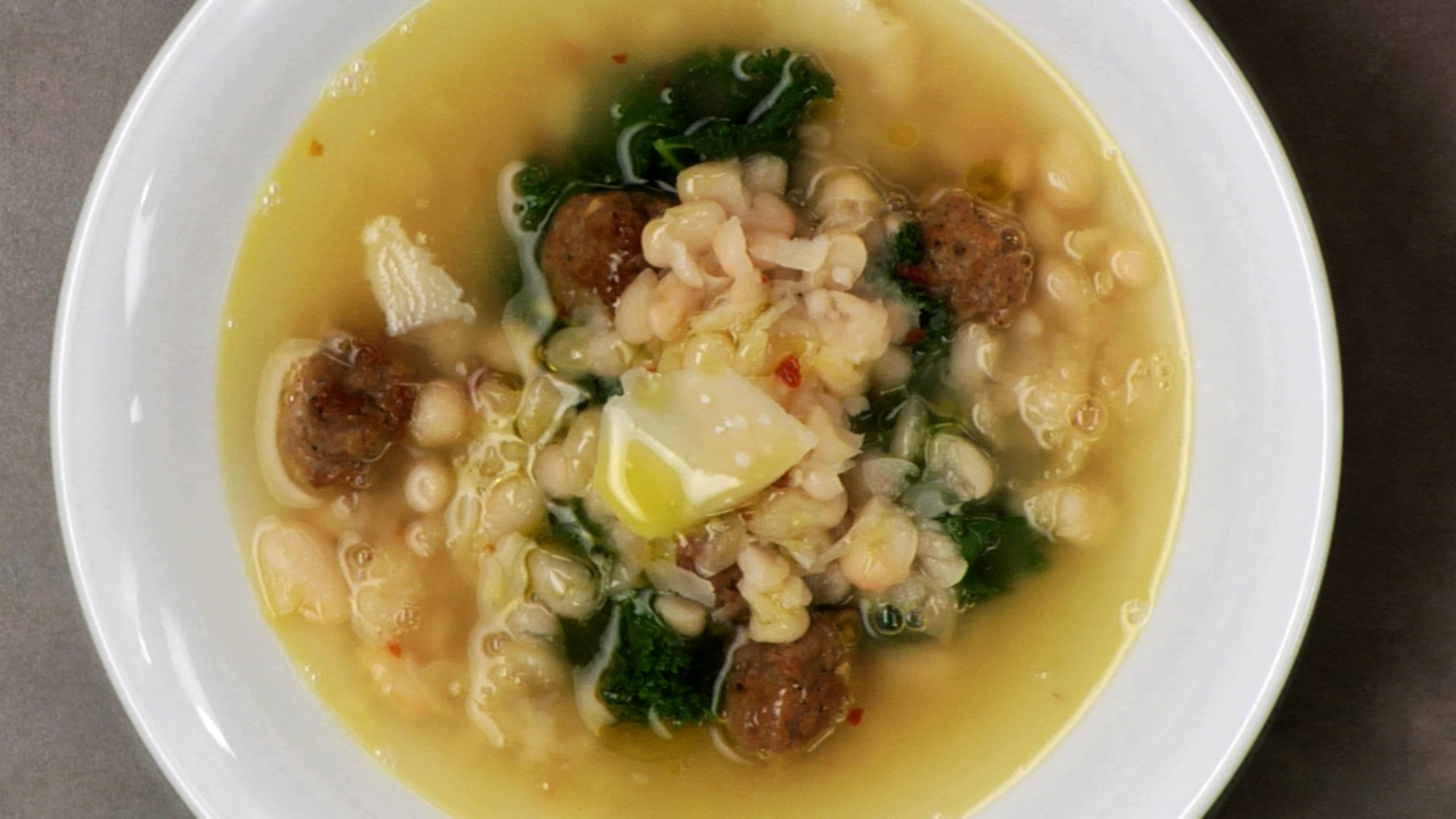 To serve the soup, place a bit of kale into a warmed bowl, followed by a few pieces of sausage. Ladle the hot soup over top. Serve with some Plant-Based Parmesan and a splash of quality olive oil.