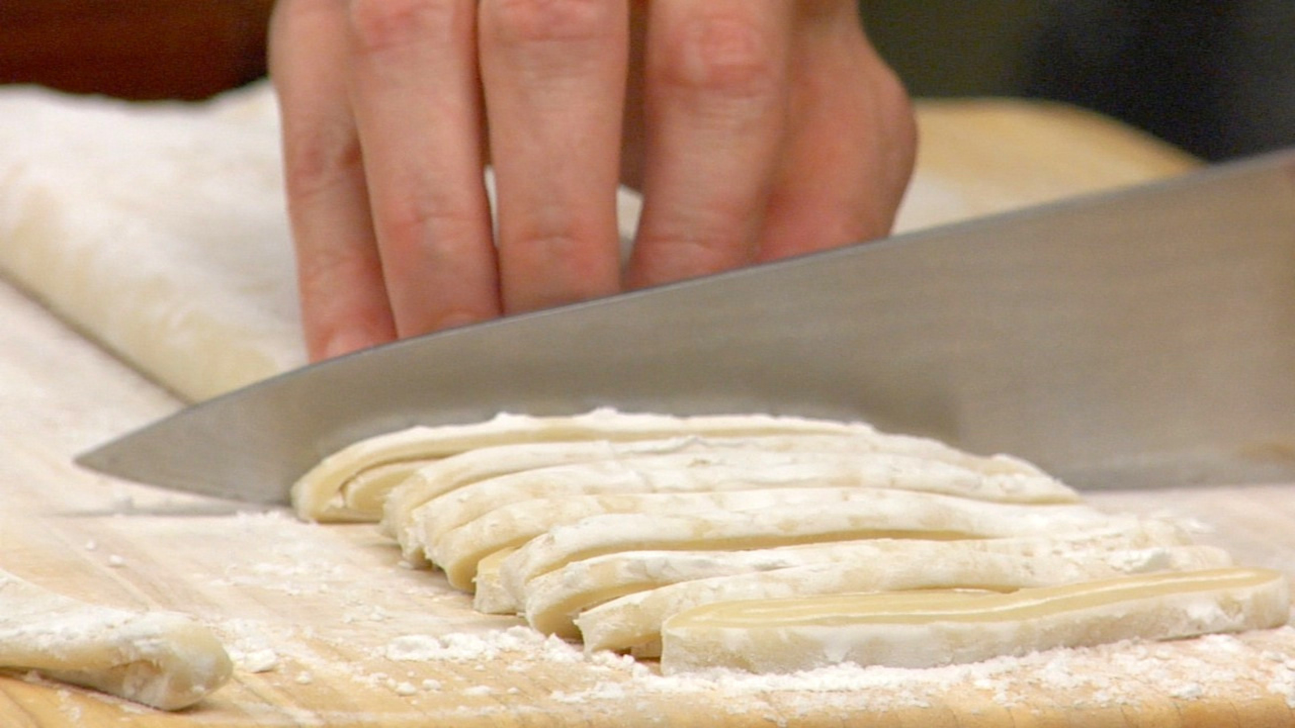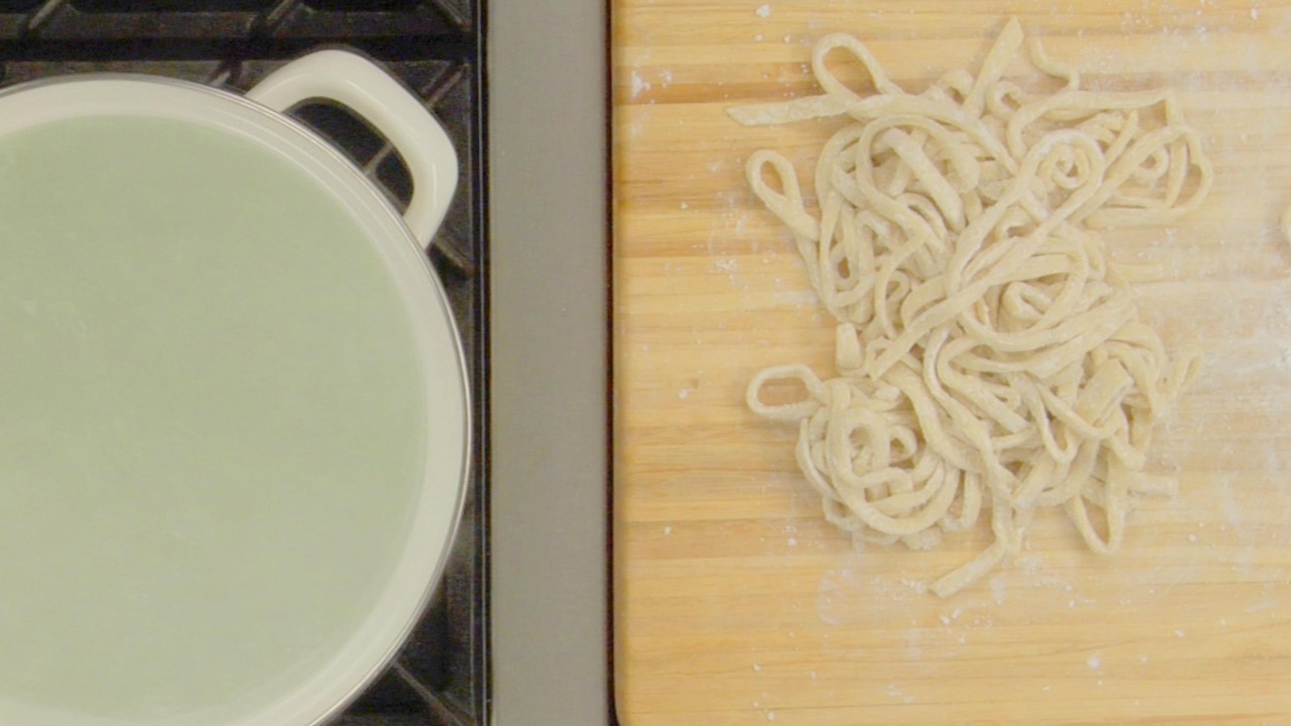 With a sharp chef’s or similar knife, begin cutting the dough crosswise into noodles about 1/4–inch wide. After cutting the noodles, separate to prevent them sticking together, using a bit more starch if needed. Set the noodles aside on a dusted counter or tray until ready to cook