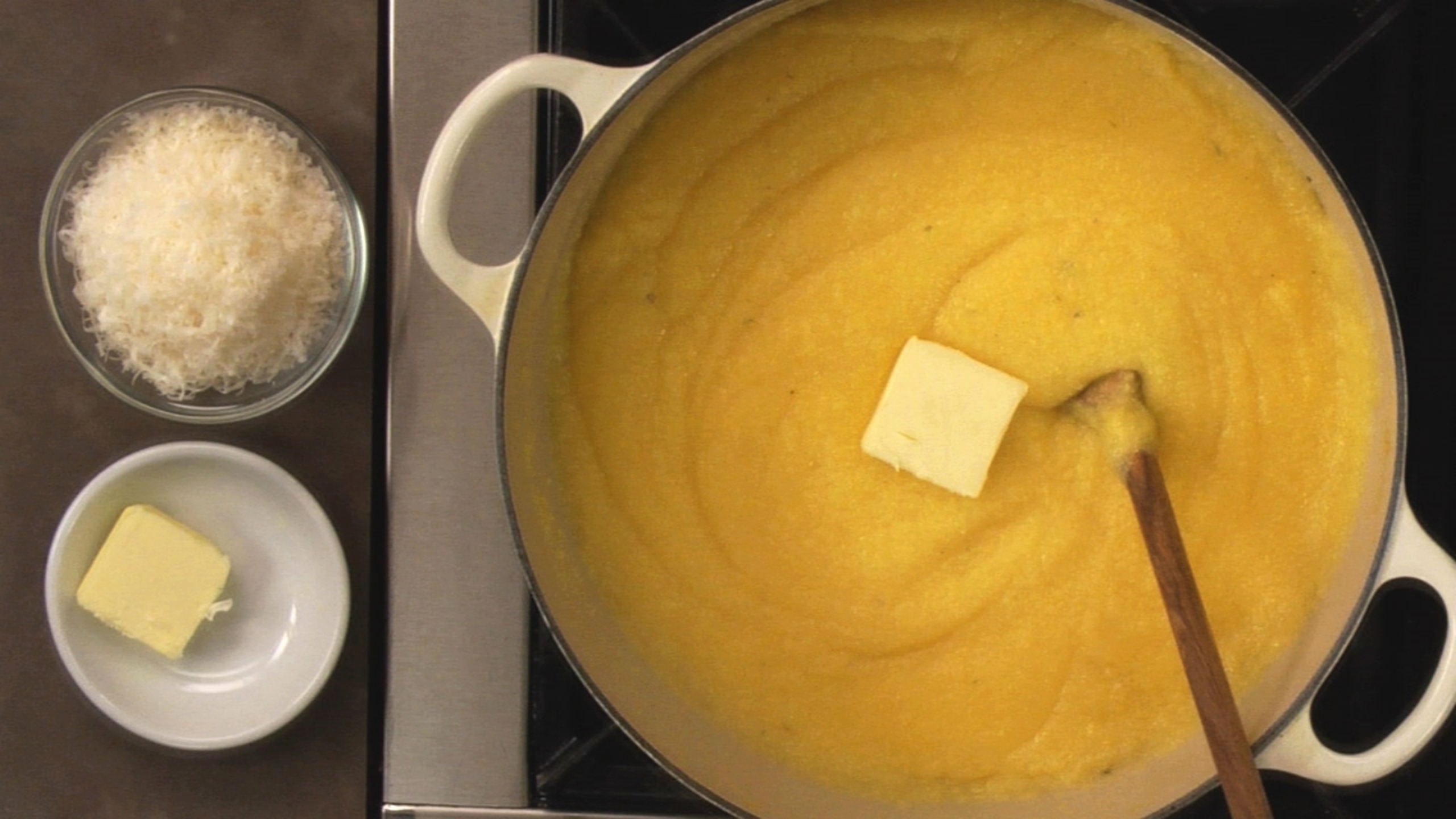 Note: For a bit more flavor and shine the polenta can be finished with a knob of non-dairy butter and some Plant-Based Parmesan, if desired.