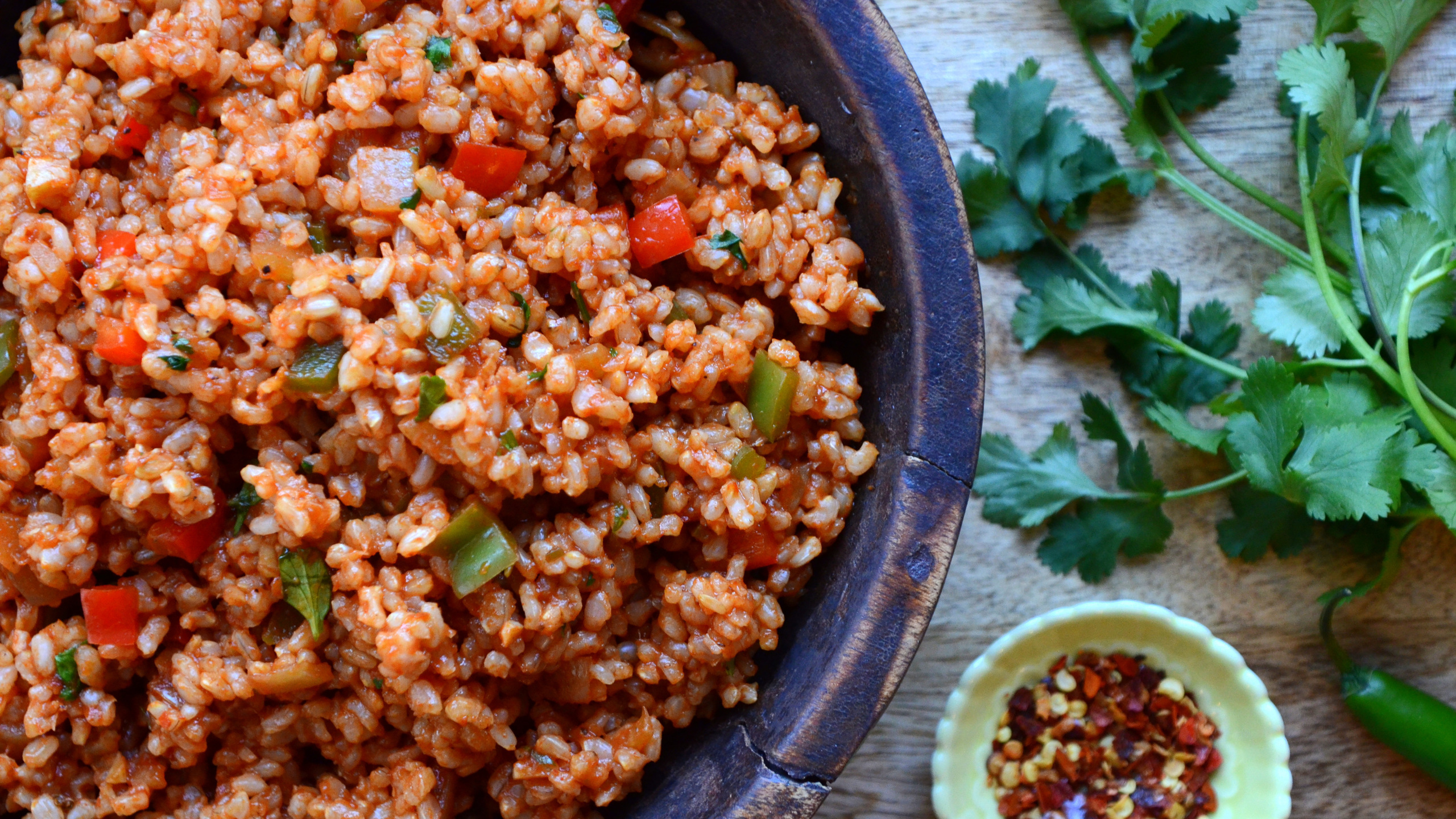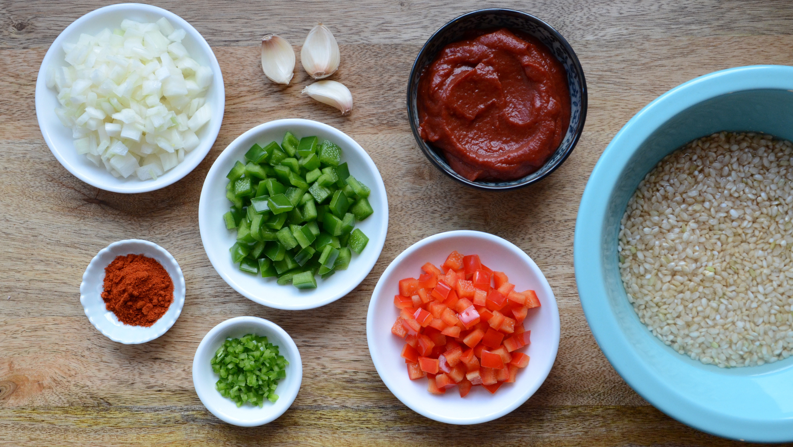 While the brown rice is cooking, prepare your mise en place. If the rice is still not done once you have prepared your mise en place, then go ahead and cook the aromatics, as per Step 3.