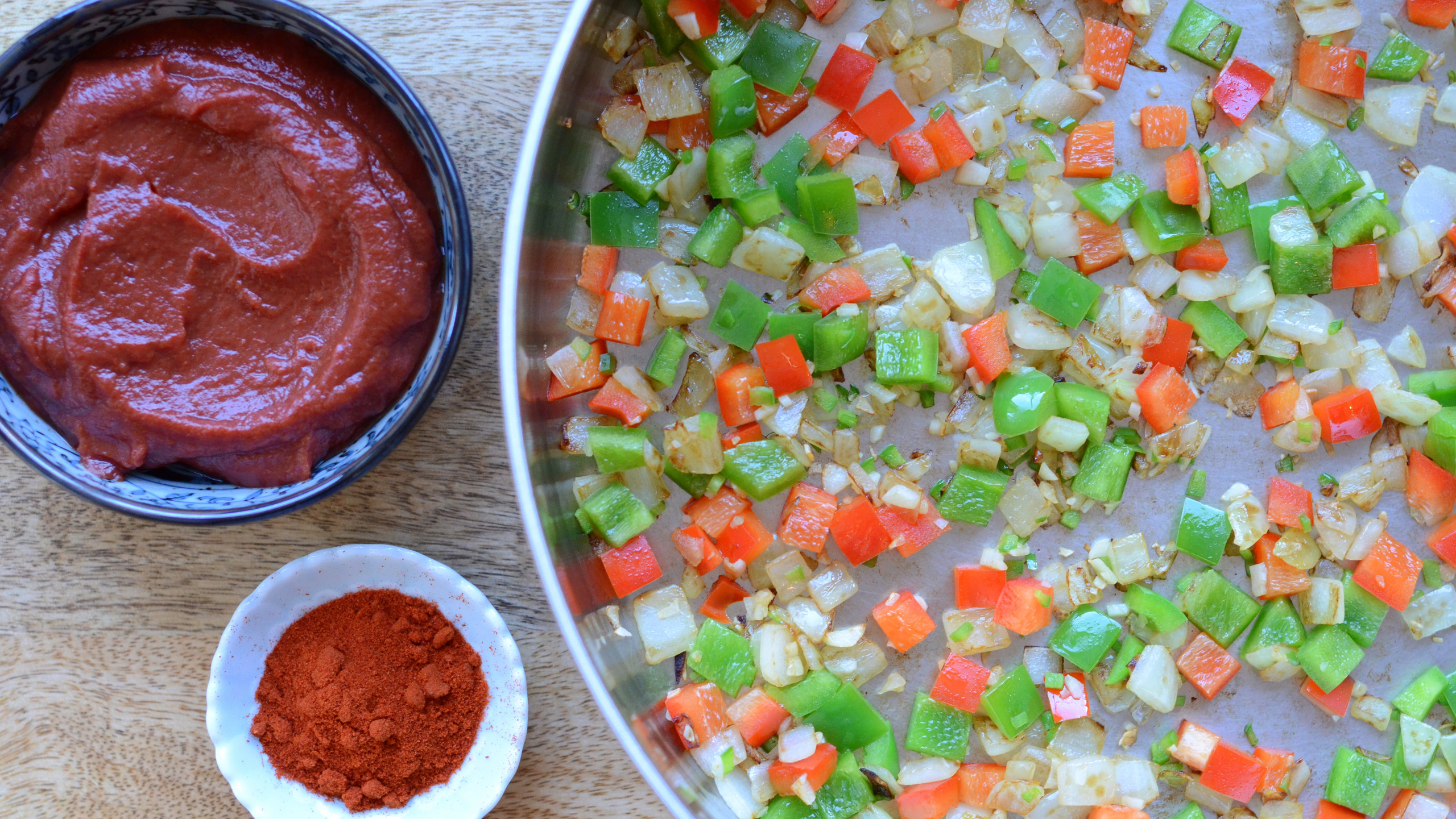 Next add the green and red peppers and cook for another minute or so. Then add the jalapeño, garlic and paprika and cook for about 30 seconds. Add the tomato paste and let cook for about a minute.