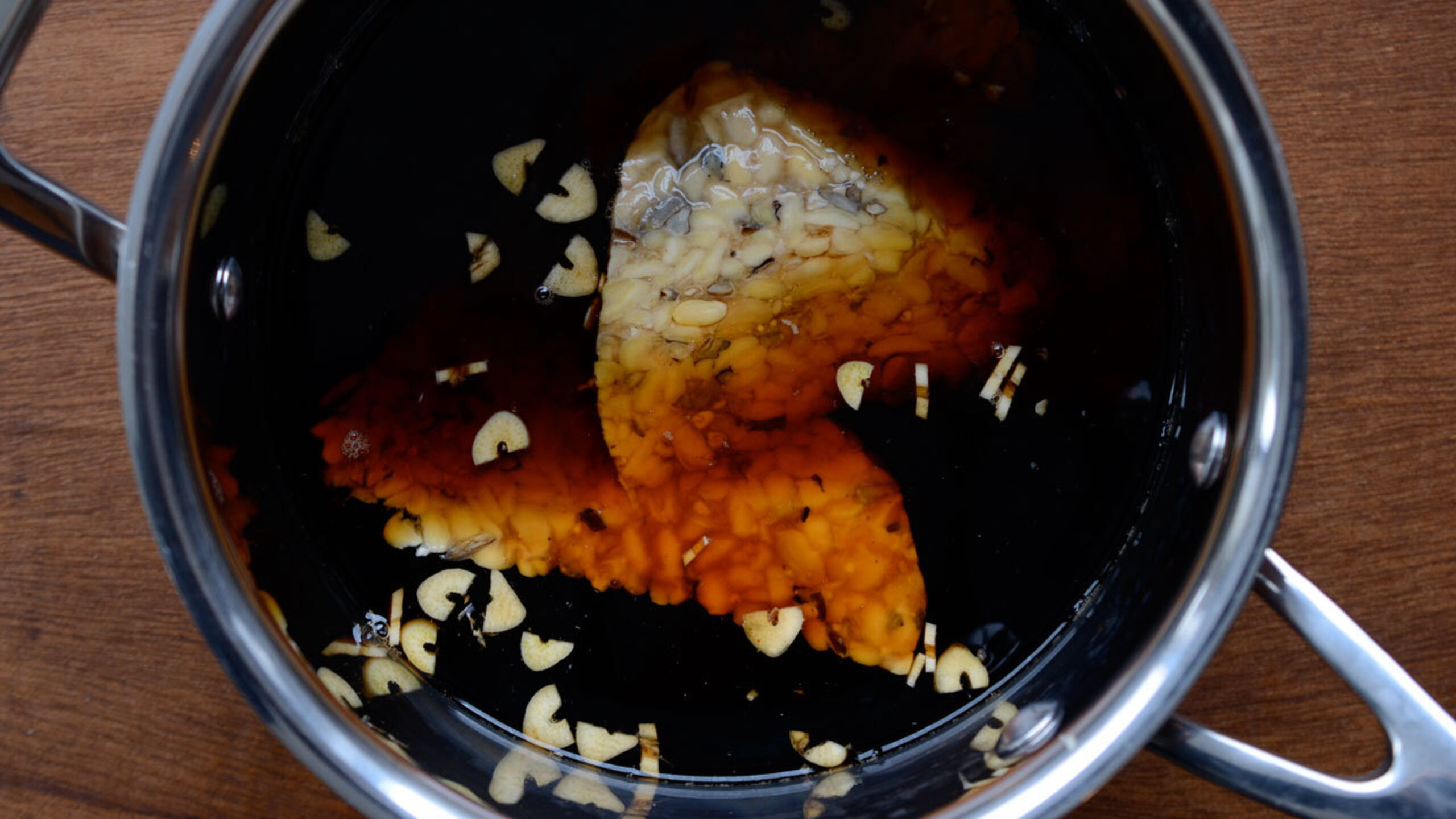 In a large pot, combine the tamari, garlic, ginger, salt and water and bring to a simmer.
