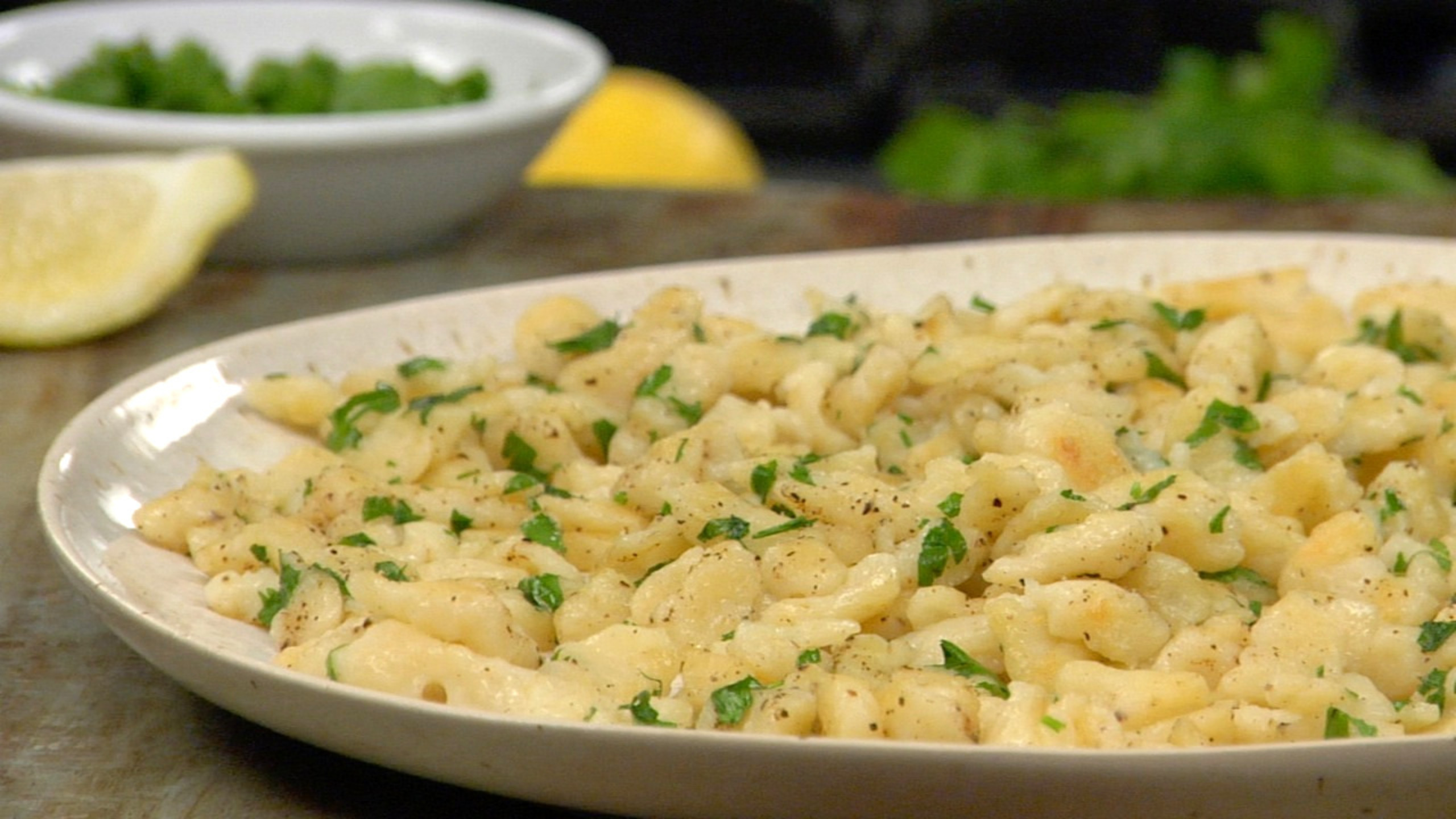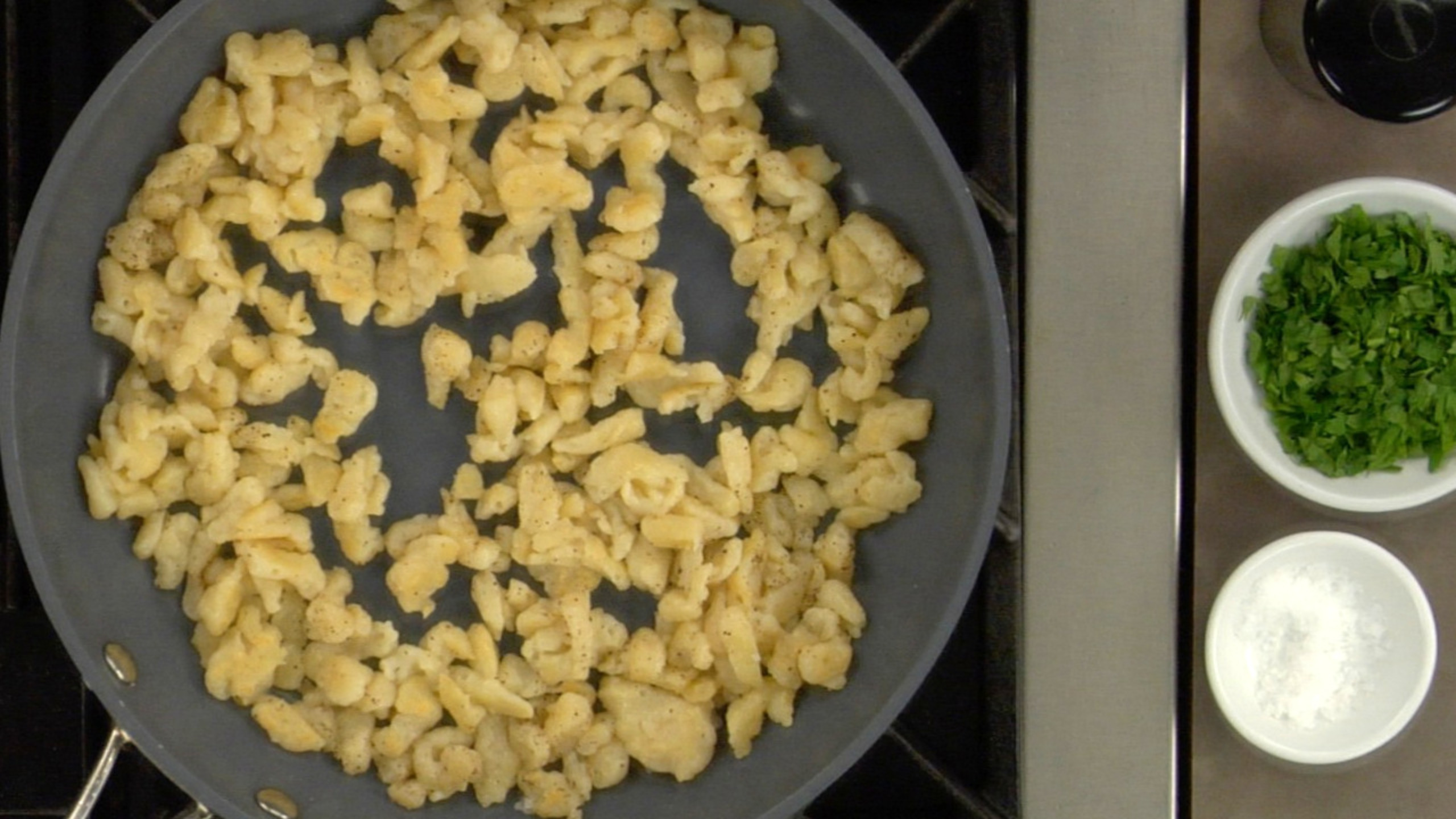 To serve, add the olive oil to a non–stick pan. When the pan is very hot, add the spaetzle, then the salt and pepper, a touch of non–dairy butter and parsley.