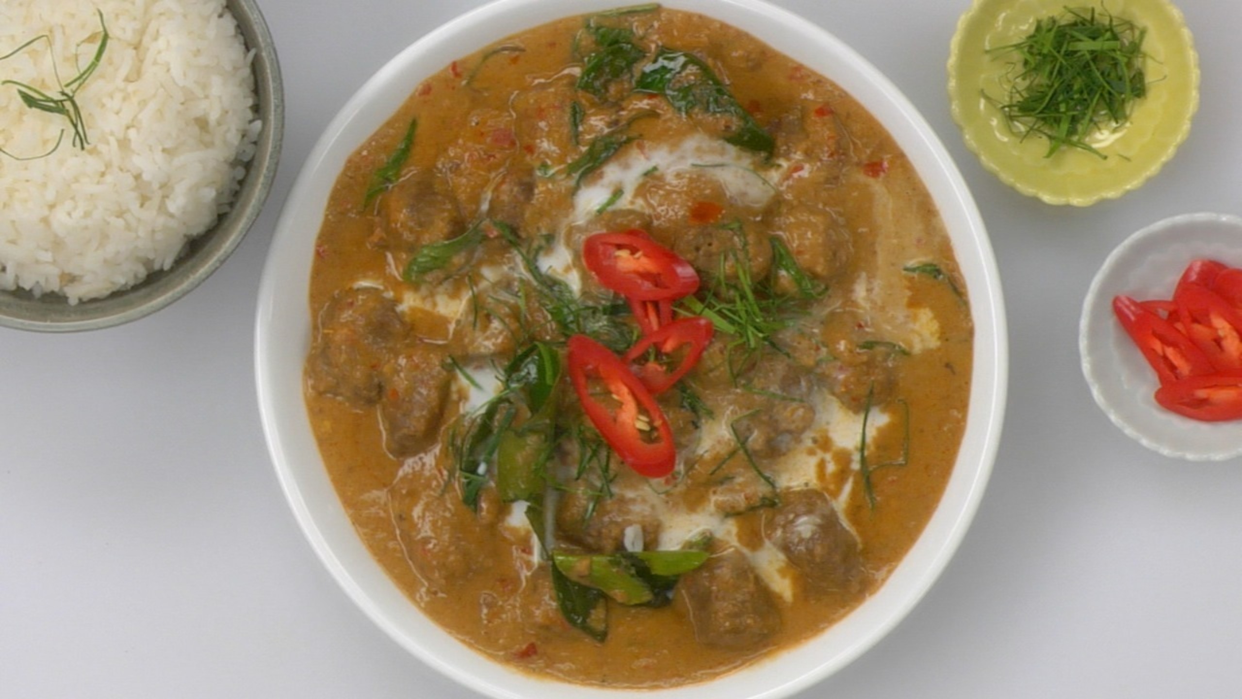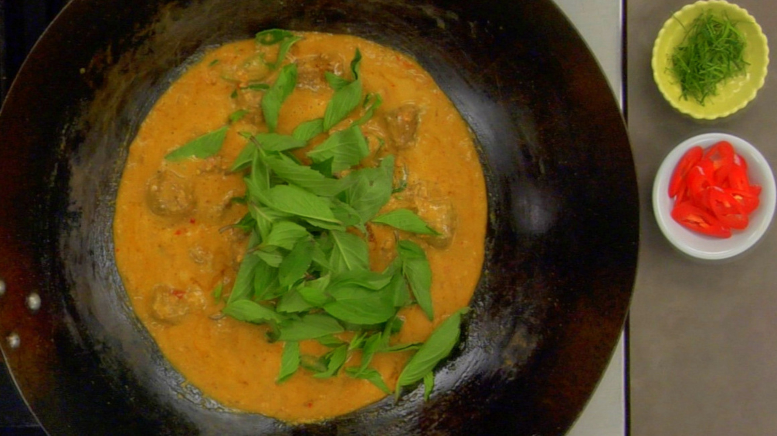 Test one of the larger pieces of beefless tips for doneness. They should be quite firm and tender. Once done, add the basil leaves. Scoop into a bowl and garnish with a drizzle of coconut milk, the chiffonade of lime leaves, red chilies and remaining basil. Serve immediately with jasmine rice.