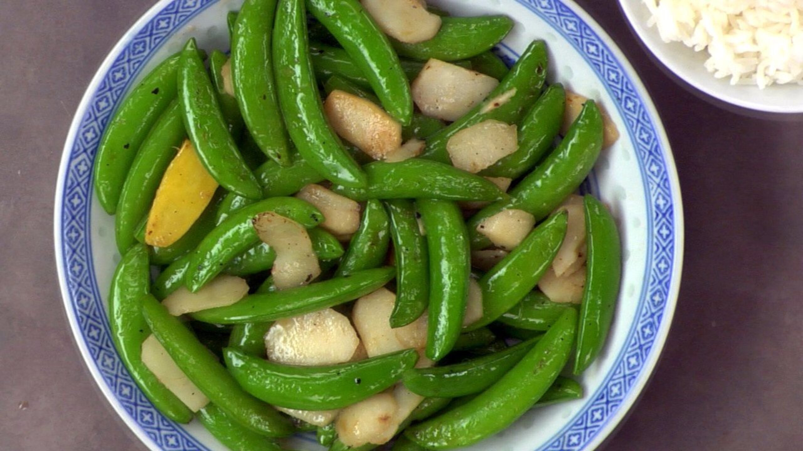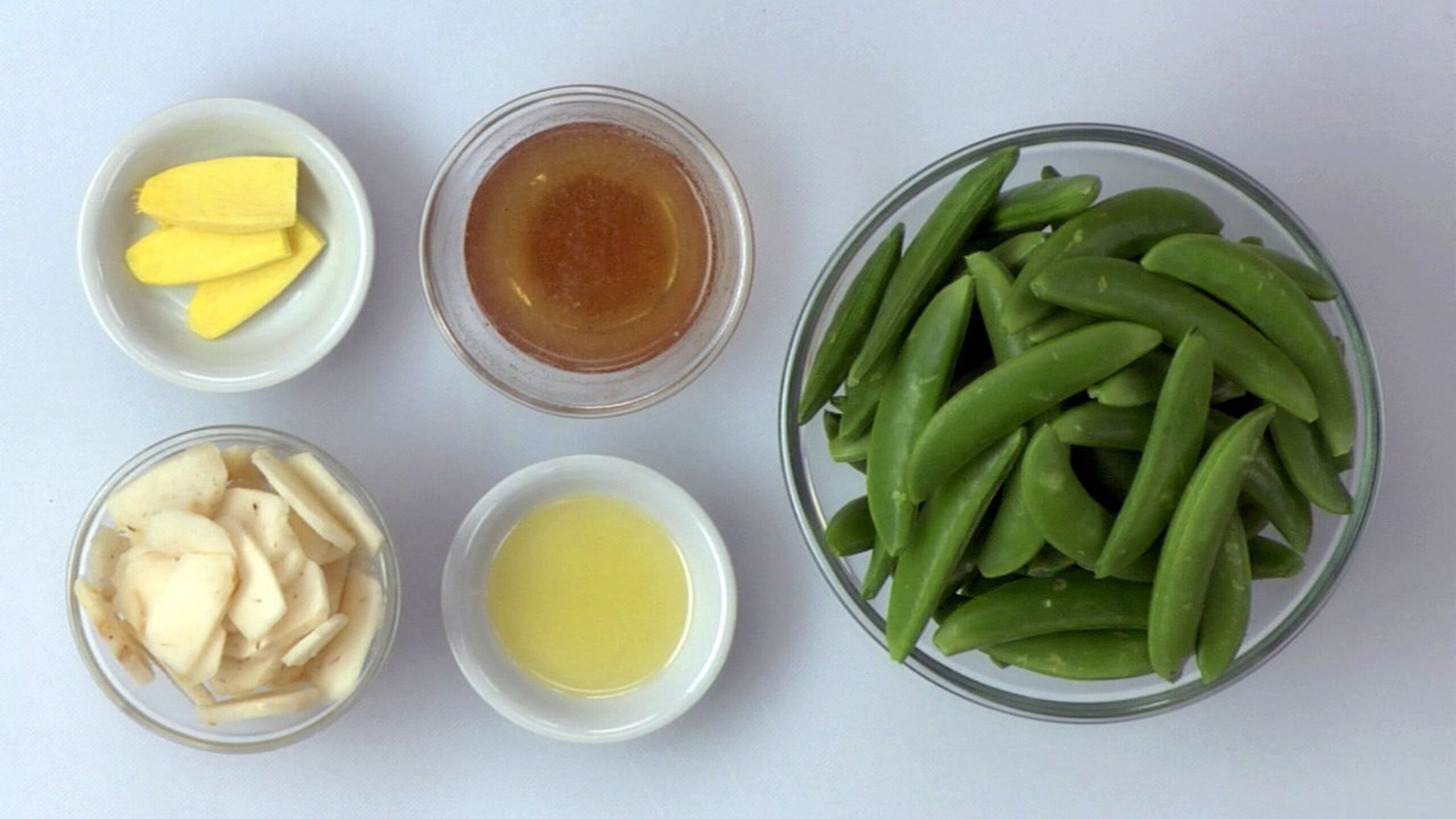 To prepare your mise en place, remove any tough strings from the snap peas. Next, slice the ginger into 3 or 4 pieces.