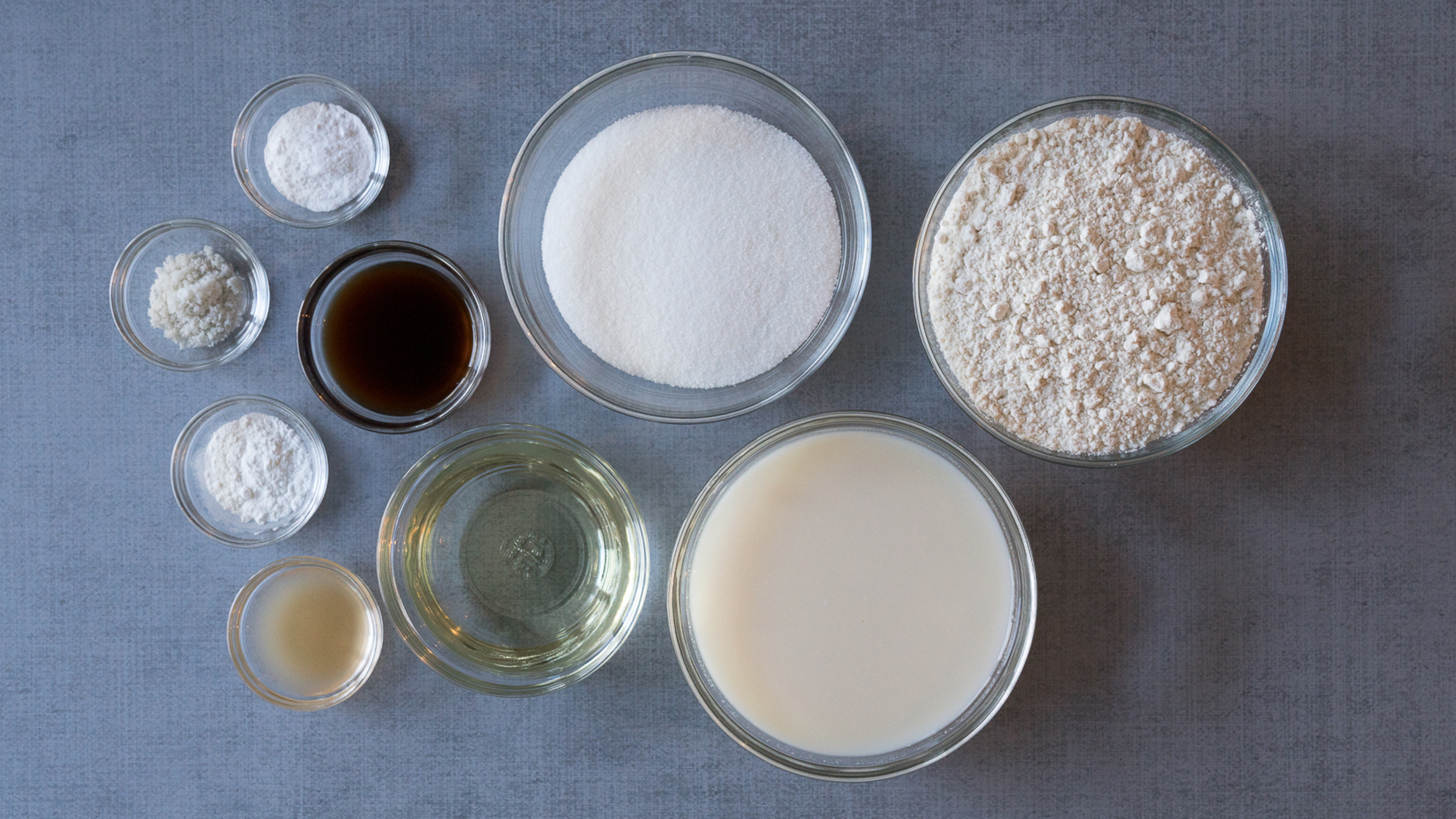 Place the oil in a medium mixing bowl. Add the milk, vanilla and vinegar and whisk until very well combined.
