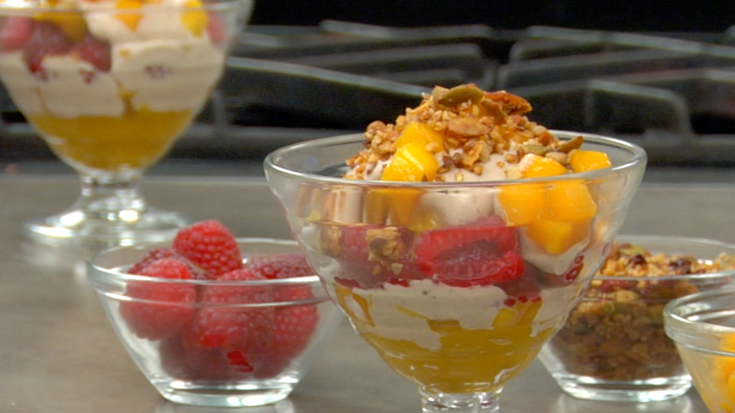 To assemble the parfaits, place a layer of fresh mango in the bottom of a glass dessert coupe. Follow with a layer of cashew cream, then raspberries, and finally a layer of the mango purée. Repeat if necessary. Garnish each parfait with an equal portion of toasted almonds and a hint of lemon zest.