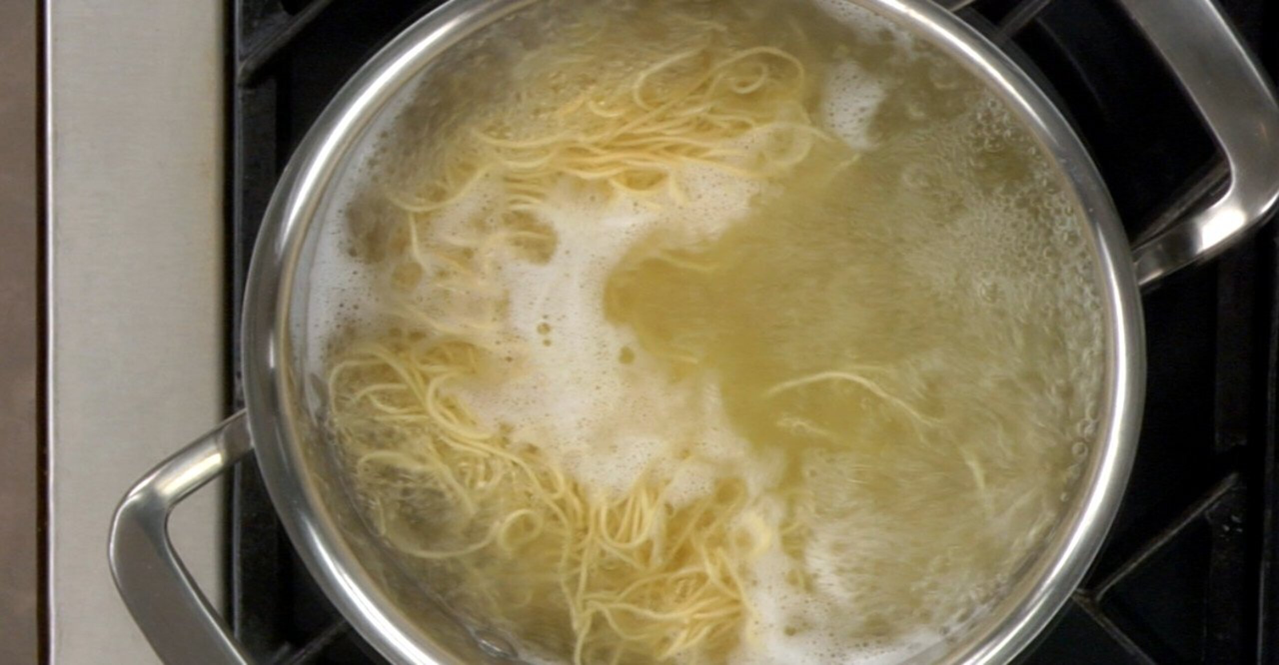 Add the noodles and let the water return to a rolling boil. Cook for approximately 1 minute or according to the package directions.
