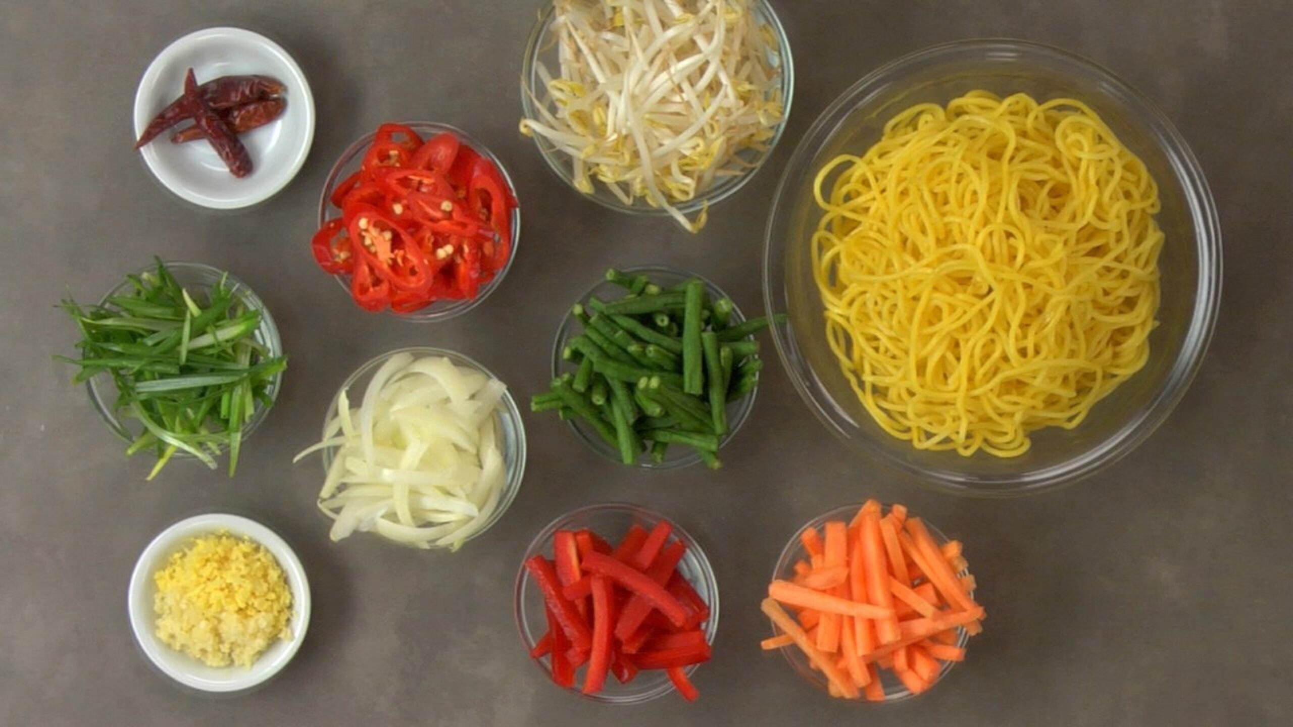 To prepare your mise en place, first slice the onions. Julienne the carrots and red peppers. Cut the beans into 2" -inch pieces. Thinly slice the Thai red chilies into rounds. Mince the ginger and garlic. Shred the green onions into thin pieces, approximately 2" -inches long. Measure out the dried chilies, sesame seeds, and/or peanuts (if using) and set aside.